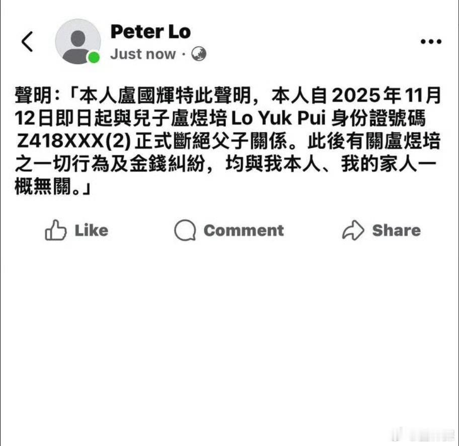据港媒,李克勤妻子卢淑仪的弟弟卷入债务风波,多年来,家人已累计为他处理了上千万债务。直至今日,卢淑仪父亲发布声明,宣布与儿子卢煜培正式断绝父子关系。对此,卢淑仪表示:“因为弟弟的债务问题,目睹年迈的父母晚年仍因此事备受煎熬,十分心痛。多年以来,我们全家已竭尽所能,多次为其处理债务,几乎倾尽所有,但情况未见改善。与家人慎重商议后,才做出这个艰难的决定。”唉,赌害人一生。