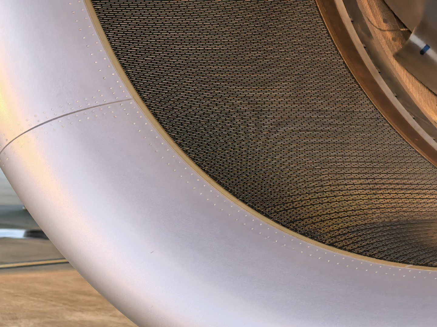 十分考验相机和屏幕素质的进气道A330neo的进气道消音版采用了碳纤维复合材料,我肉眼观测了一下,应该和350上的完全一致。看起来摸起来都很爽,就是十分考验相机的解析力。