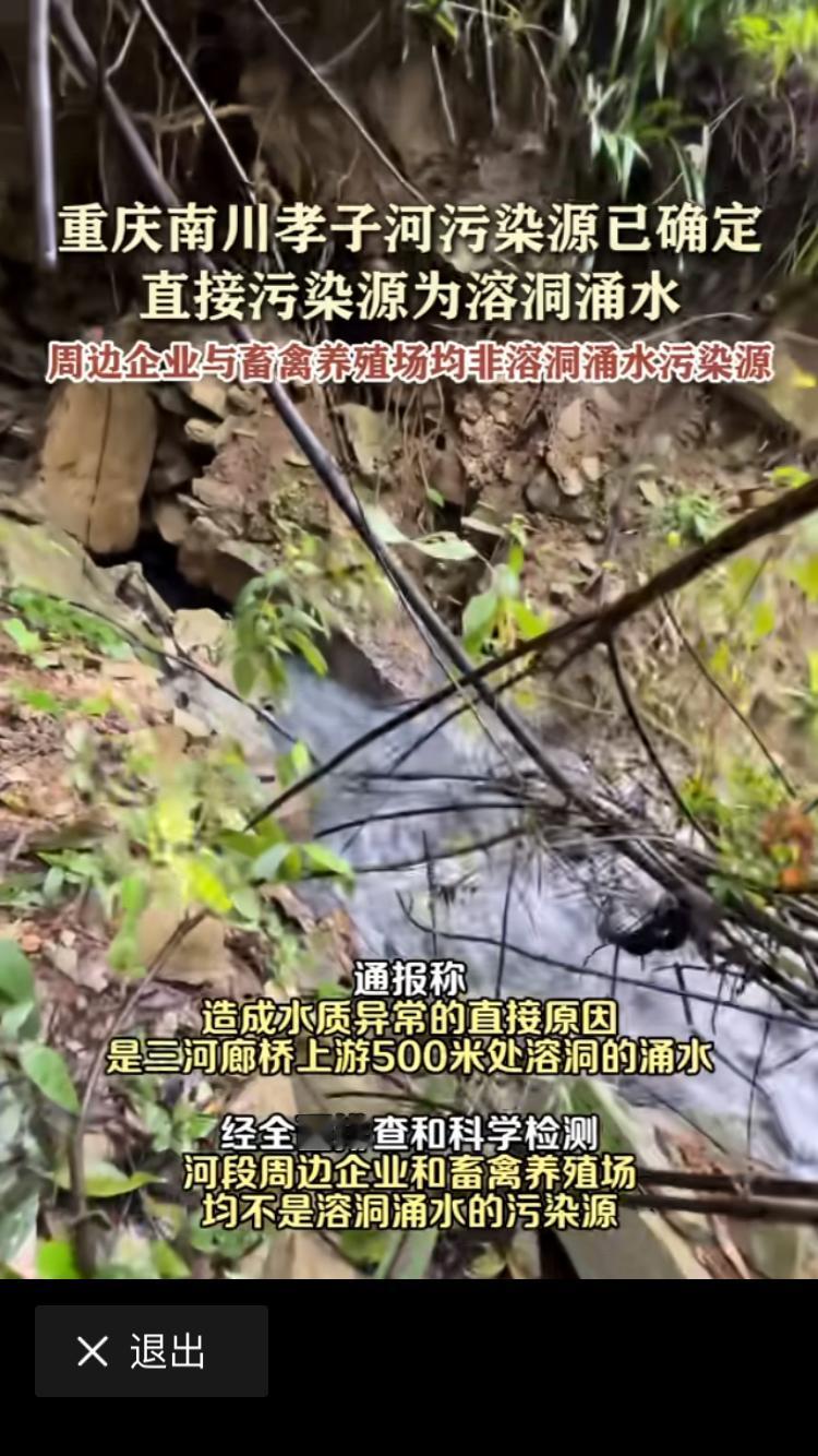 重庆南川孝子河污染源已经确定,不是周边企业偷排导致。属于地下水涌出导致了污染。 因为附近的煤矿采空层与最近地下水位变化,导致压力不均,混合地下污染物涌出溶洞出现污染河水现象。 请大家放心,经过相关部门非常科学和全面的排查,发现绝对不是周边的工业园与养殖企业。