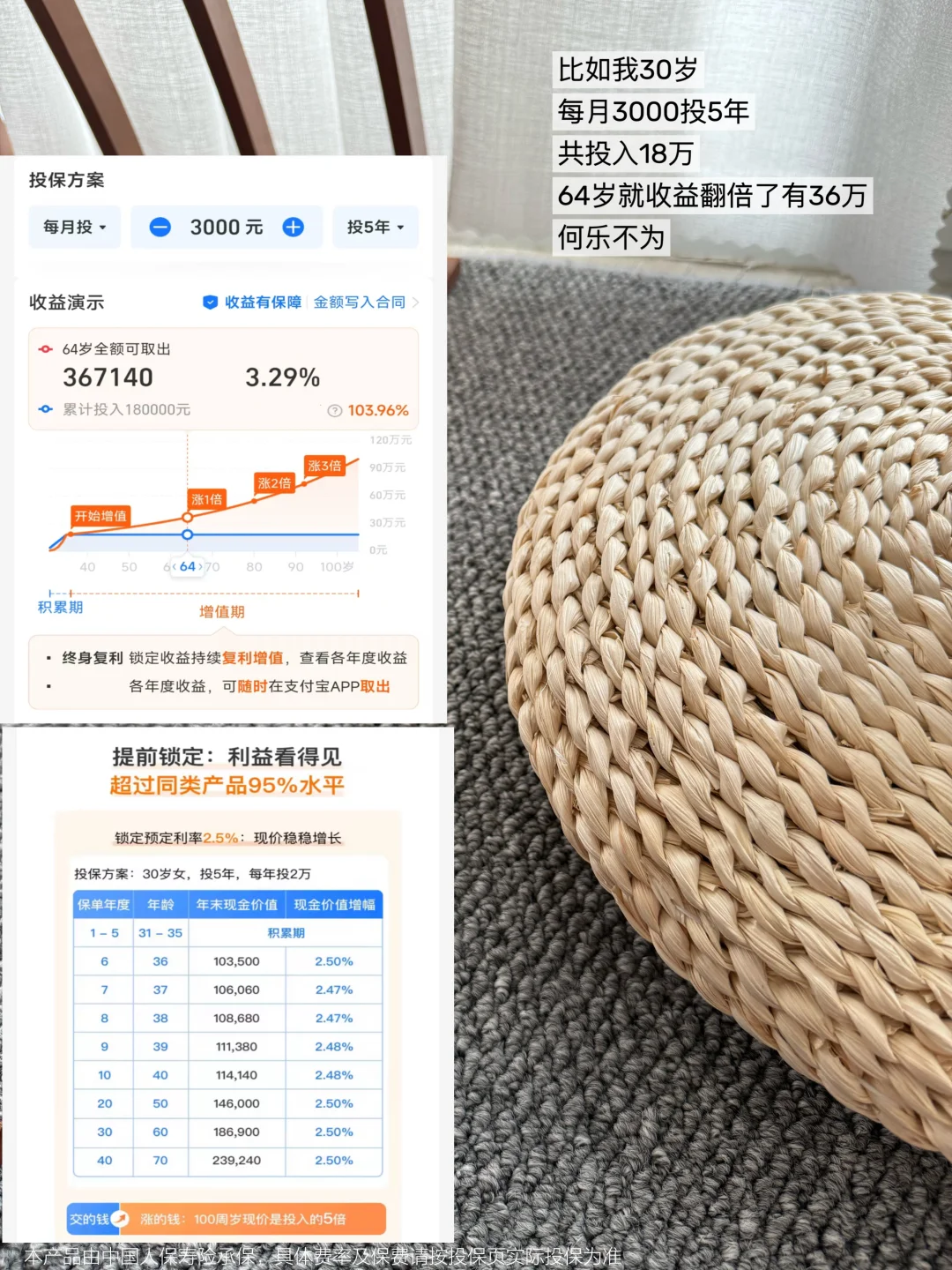 即它是把收益白纸黑字写进合同,有法律保护的。,又在足期保障本金的基础上,收益还在寿险老七家排在前列!比如我30岁,每月3000,投5年,并不影响生活,64岁就有36万,本金直接翻了一倍,何乐不为。