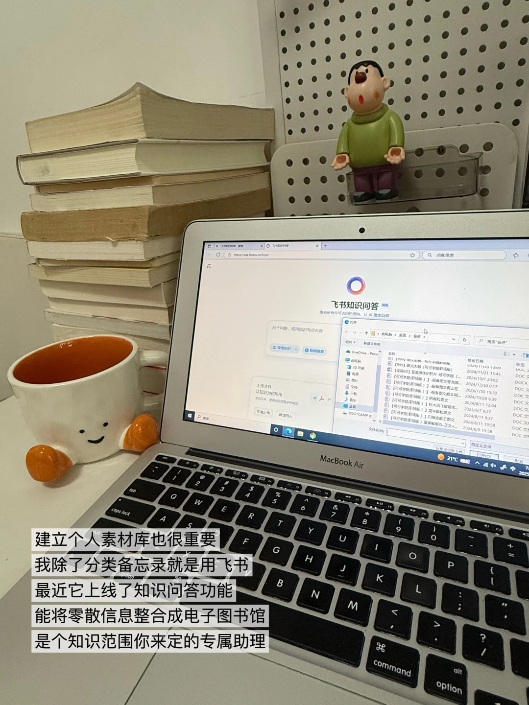 9.建立个人素材库。我一直爱用飞书办公,刷到它家视频,发现上线了知识问答功能,这就是建立个人知识库的好工具!就是我们平时的非涉密文档、纪要甚至聊天记录都能储存在里面,它能将零散信息整合成电子图书馆。我们问它问题时,它自动整合你先前输入的信息回答你,无需自己再去电脑扒拉。