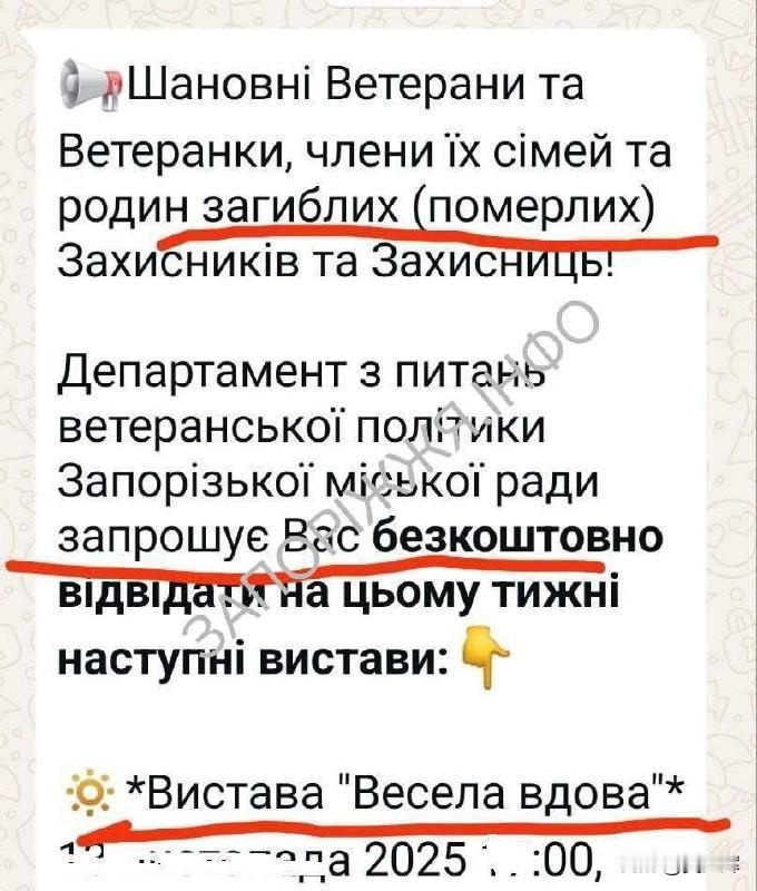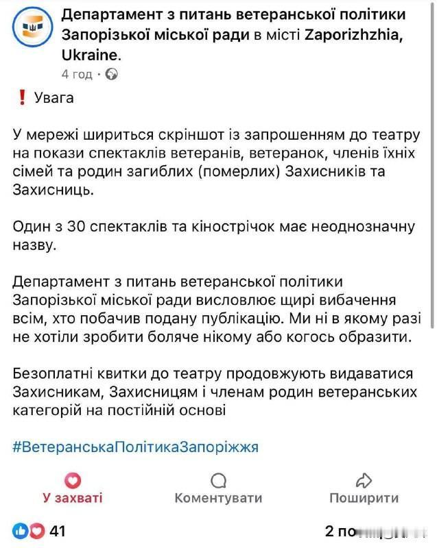 乌克兰扎波罗热市邀请退伍军人、其家属及阵亡将士亲属免费观看话剧——剧名竟为《风流寡妇》 相关事件引发轩然大波后,扎波罗热市议会退伍军人事务部公开致歉。该部门表示,在计划举办的30场演出中,有一场的剧名“存在歧义”。声明中写道:“我们绝无任何意图伤害任何人或冒犯他人的感情。”