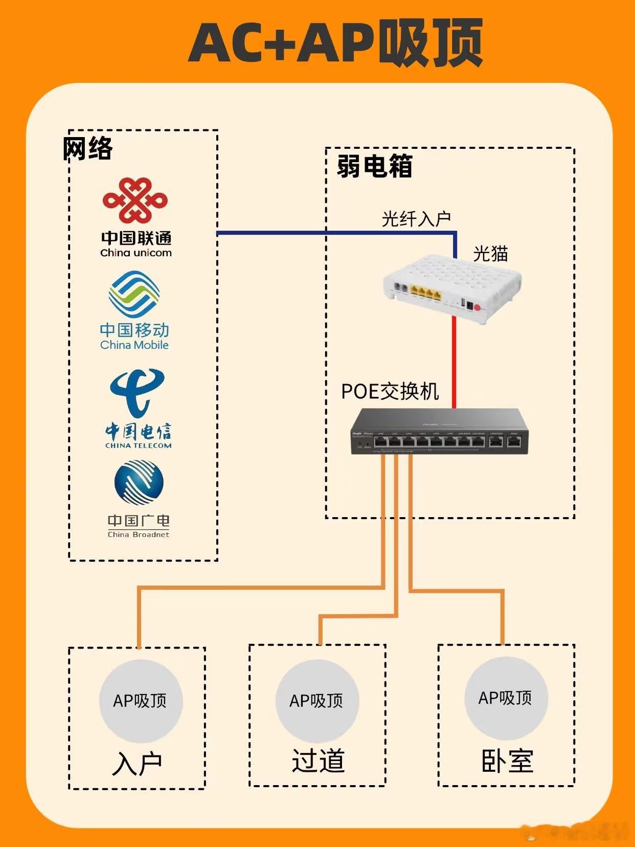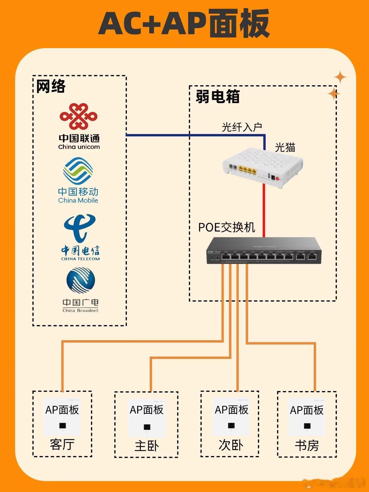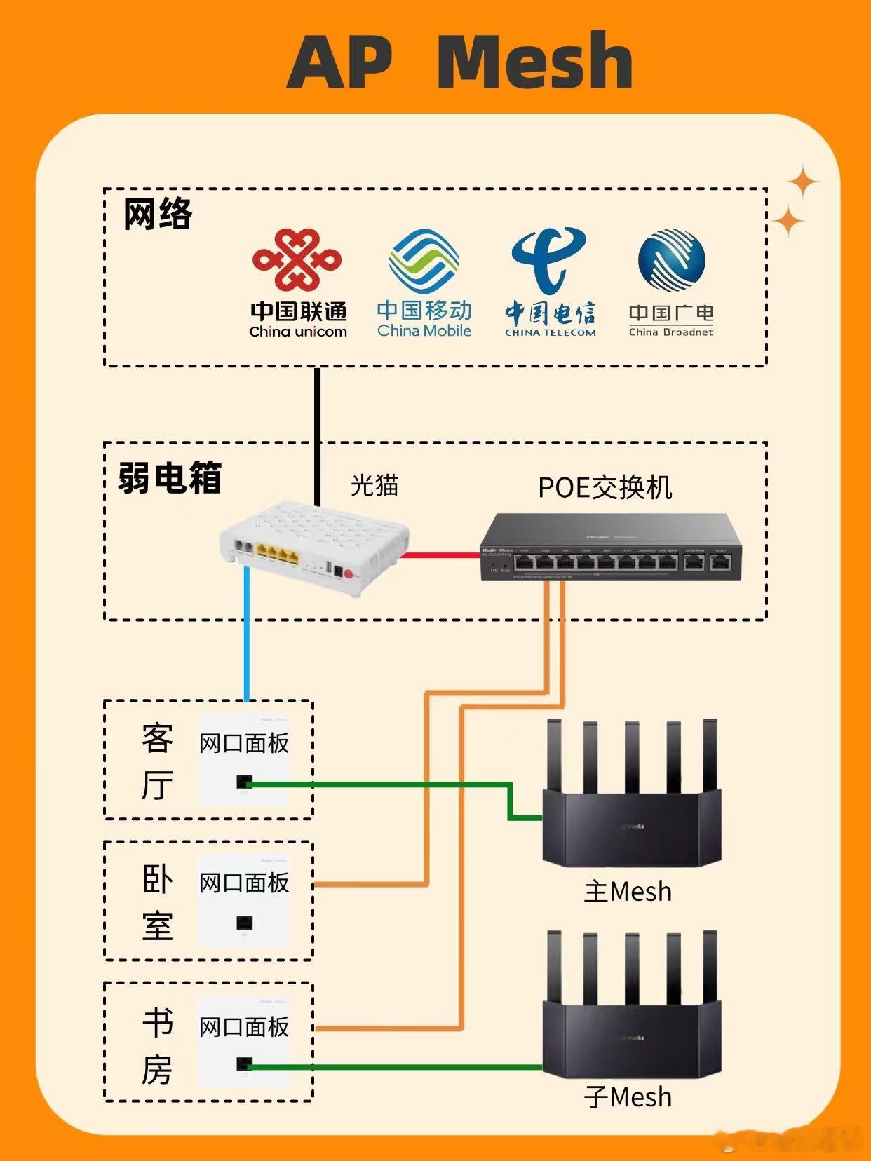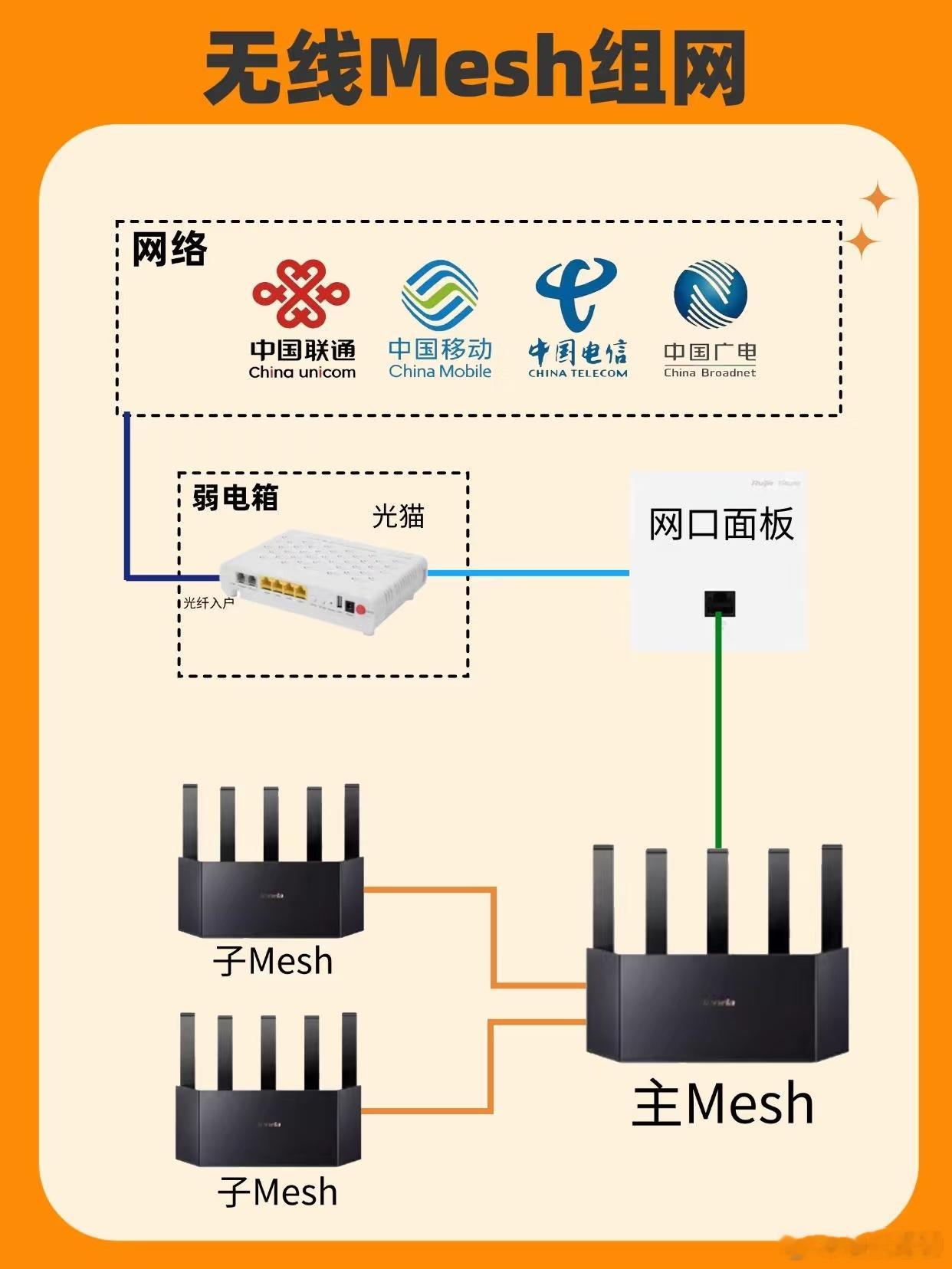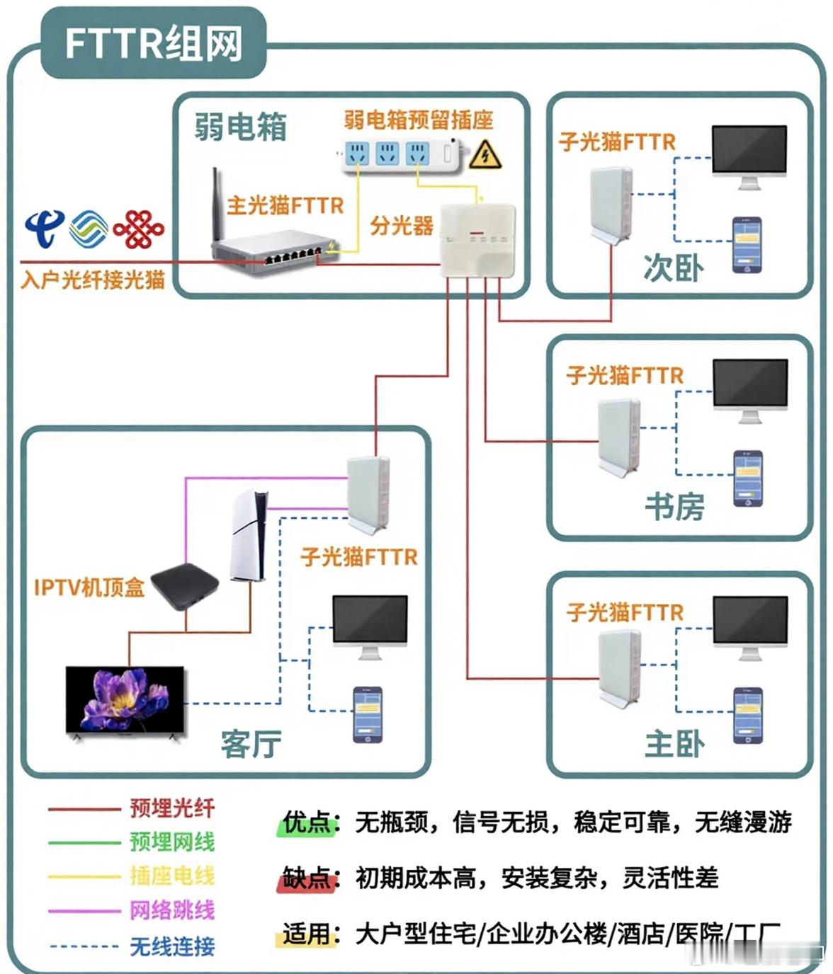 全屋WiFi的四种自行组网方式示意图!另外还有一种就是运营商提供的FTTR。