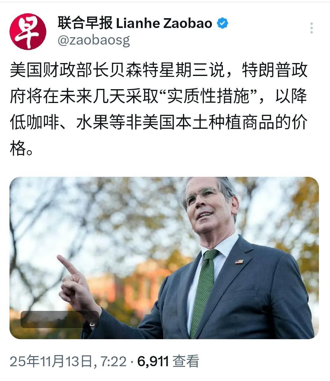 联合早报今日(11月13日)报道:美国财政部长贝森特星期三说,特朗普政府将在未来几天采取“实质性措施”,以降低咖啡、水果等非美国本土种植商品的价格。 评几句:所谓“降低关税缓解民众压力”,不过是特朗普政府自食恶果,为错误政策买单罢了。对美国不生产的商品加征关税,不会创造就业,只会提高成本。损害的只能是美国消费者的钱包和美国企业的生存。