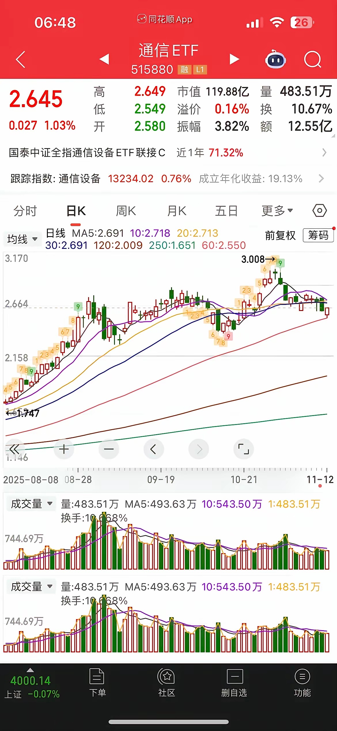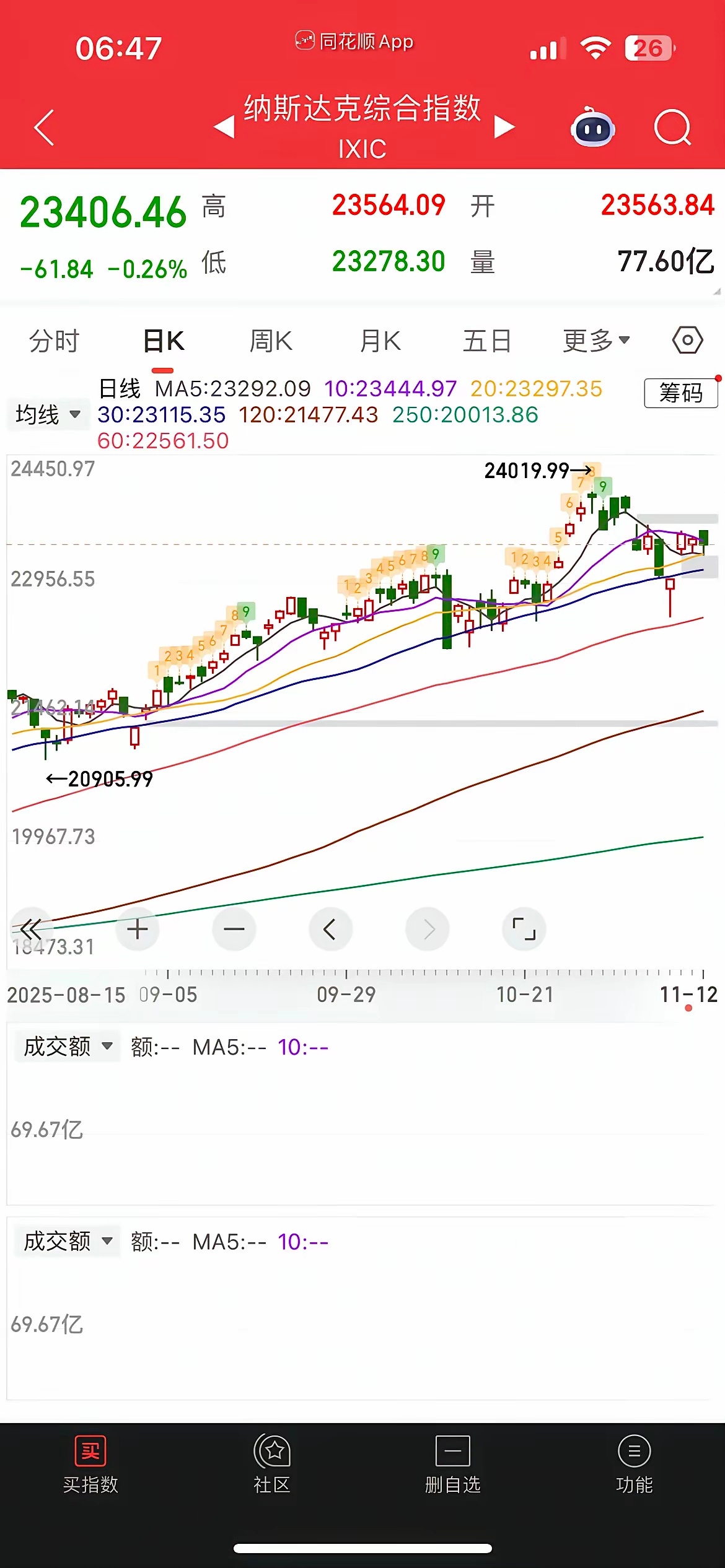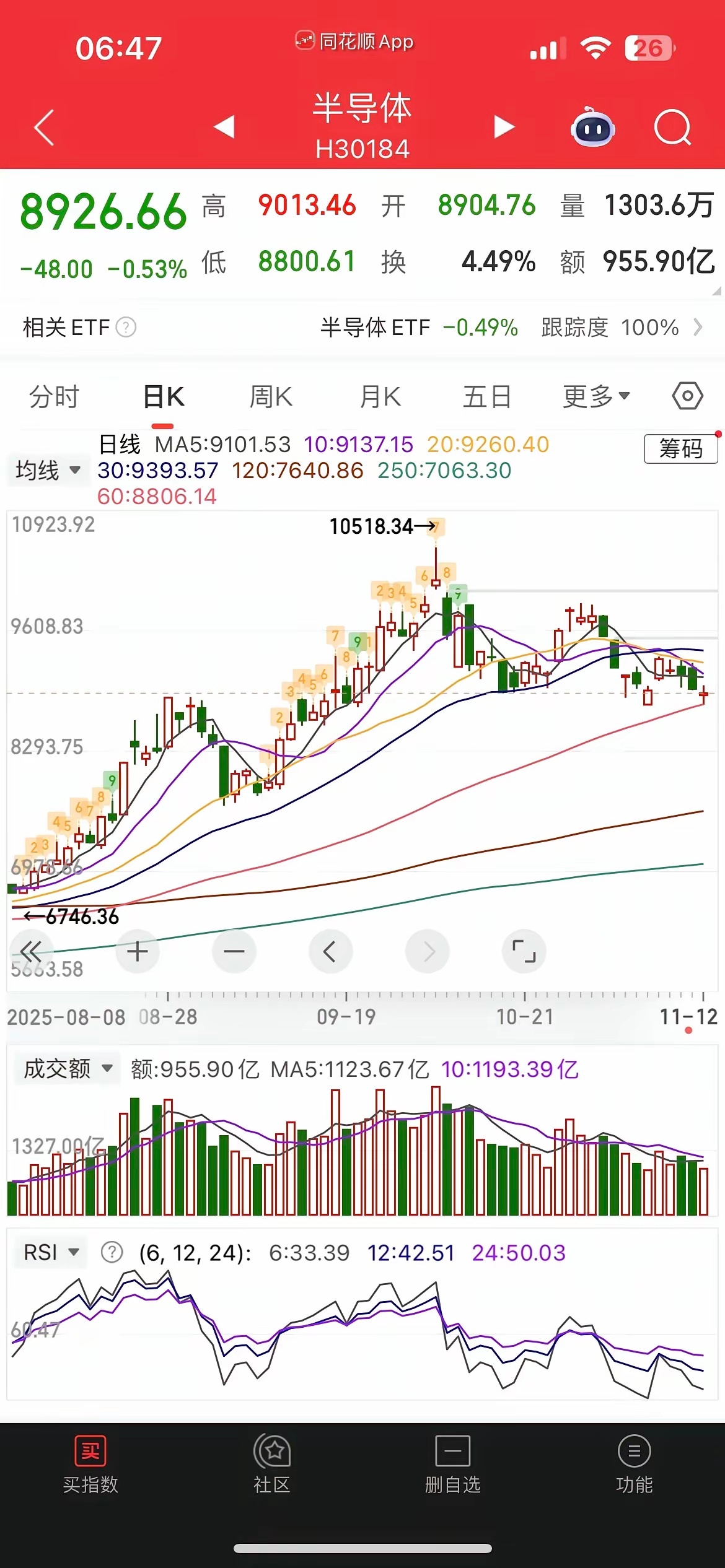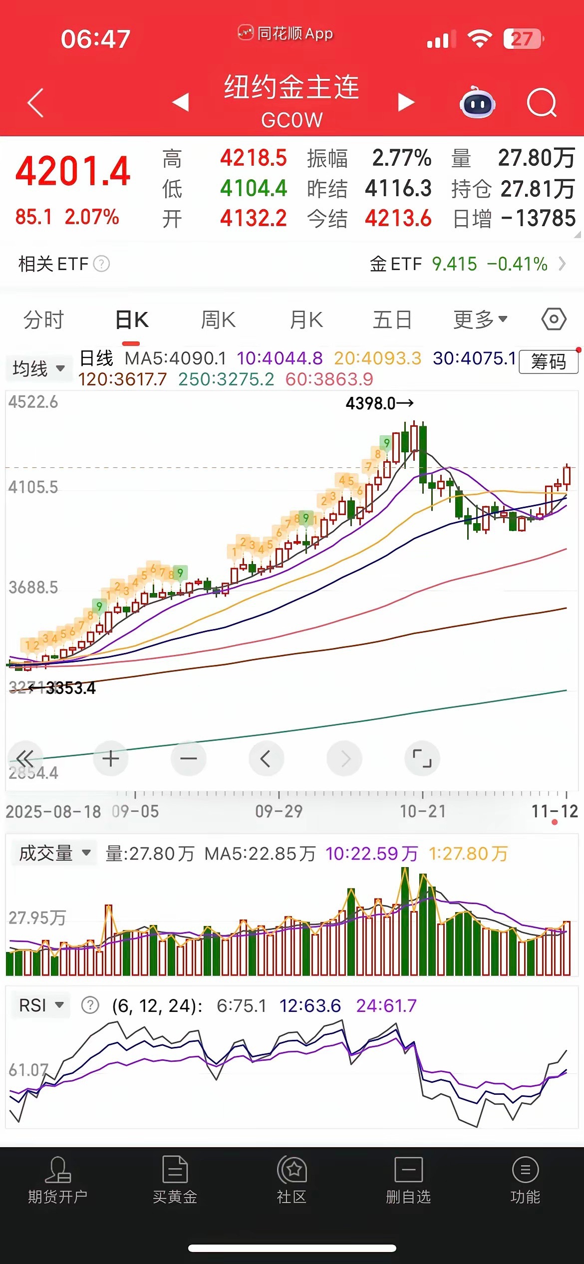 一觉醒来,黄金大涨,中概股普跌,纳指金龙指数1.46%,阿里、百度跌近2%,小鹏跌近3%,拼多多、京东跌近1%,百济神州大涨近10%,大全新能源跌近10%,富时A50跌0.1%,恒生主连跌0.26%,这样看今天我们大A可能会小幅低开,不过低开高走概率大,而港股今天有望冲击4连阳。昨晚美股三大指数涨跌不一,道指涨0.68%,再创历史新高,纳指跌0.26%,大型科技股涨跌不一,英伟达涨0.33%,特斯拉跌2%,苹果跌0.6%,美光科技涨逾1%,AMD暴涨9%,甲骨文大跌近4%,台积电跌0.18%,现在看美股也分化厉害,小登科技股涨不动,传统蓝筹老登上位接力创新高,和大A的剧本一样。昨天市场探底回升,农王扛旗,内资跑了800多亿,沪指险守4000点,稳如老狗,双创却连跌4天,中证红利指数则录得8连阳,极端分化,两市缩量近500亿,目前总成交额已经不足2万亿,没有量资金又开始步入防御避险状态,也就是银行生,万物死,板块上昨天银行、保险、创新药逆势走强,农行、工行双双新高,而光伏、新能源稀土全线重挫,CPO和半导体半死不活,机器人4连杀,存储延续强势,现在看市场热点杂乱,板块飞速轮转,科技硬不起来,市场就半死不活,所以半导体和CPO啥时候止跌企稳,市场赚钱效应就啥时候打开、不然继续温水煮青蛙,今天看估计还得吃药。