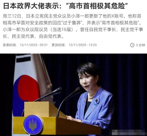 11月12日,根据法新社报道,日本立宪民主党众议员小泽一郎表示,首相高市早苗对安全政策的回应过于鲁莽,涉及国家安全保障,也就是关乎国民生命与国家命运的问题,她的态度太过轻率。 自10月高市早苗上任以来,这位以极端保守立场著称的首相便频繁在台湾问题上试探红线。11月10日的国会预算委员会会议上,面对立宪民主党议员的质询,她再次将台湾问题与日本生存直接挂钩,甚至以“假设性回答”为辩解,声称“这是针对最坏情况的预判”。 然而,这种模糊的表述未能平息争议,反而让日本政坛陷入更深分裂——反对者指出,她将台湾问题与日本安全捆绑的逻辑,既违背1972年《中日联合声明》中“一个中国”的承诺,也与日本新安保法中“存立危机事态”的适用条件严重脱节。 小泽一郎的批评直指核心。这位曾担任自民党干事长的资深政客在社交媒体发文称,历史已多次证明,政客轻率煽动“外部威胁”极易引发连锁反应:“从‘九一八事变’到珍珠港事件,日本军国主义曾以‘生存危机’为借口发动侵略,最终让国民付出惨痛代价。 如今高市首相的言论,与当年制造‘满蒙危机’的逻辑如出一辙。”他特别强调,首相的每一句话都可能影响国家命运,“在涉及战争与和平的重大问题上,容不得半点投机”。 这场争议的背景,是中日关系本就脆弱的现状。2025年恰逢中国人民抗日战争胜利80周年与台湾光复80周年,中方多次敦促日方反思历史、谨言慎行。 高市早苗的表态却被中方视为“重蹈军国主义覆辙”的信号——中国驻日大使馆发言人11月10日严正指出,日方炒作“台湾有事就是日本有事”,不仅违背国际关系基本准则,更是在“绑架日本国民为分裂中国的战车陪葬”。日本媒体《东京新闻》也刊文质问:“高市首相是否意识到,她的一句话可能将日本推向存亡边缘?” 值得玩味的是,高市早苗的极端立场并未获得日本政坛普遍支持。除小泽一郎外,前首相鸠山由纪夫也公开批评其“借危机扩张军力”,甚至有自民党内部人士透露,部分阁僚对首相的“冒险言行”感到不安。 这种分裂反映出日本社会的深层矛盾:一方面,右翼势力试图通过强化军事存在提升国际地位;另一方面,多数民众仍对战争记忆心有余悸,担忧重蹈历史覆辙。 从地缘政治视角看,高市早苗的“台海牌”更像是一场危险博弈。台湾海峡是日本能源进口的生命线,但将中国维护主权的正当行动定义为“威胁”,无疑颠倒了因果关系。 中国外交部发言人此前曾明确警告:“台湾问题纯属中国内政,任何外部势力干涉都将引火烧身。”而高市早苗的表态,恰恰暴露了日本部分政客对地区格局的误判——他们试图通过绑定美国印太战略提升话语权,却忽视了中国维护核心利益的坚定决心。 这场争议的结局仍充满变数。高市早苗虽在11月10日国会辩论中辩称“将避免具体表述”,但其核心立场未变;中方则通过严正交涉划清红线,要求日方“立即停止越线挑衅”。 对于日本民众而言,更现实的担忧或许来自国内——有政治学者预测,高市早苗的强硬路线可能加速政权更迭,日本或将重回“一年一相”的动荡周期。 历史总是惊人相似。当政客为私利煽动危机时,最终买单的往往是普通民众。小泽一郎的警告犹在耳畔:“言语有时比刀剑更锋利,因为它能撬动战争的杠杆,却未必能承受其后果。” 这场争议的走向,不仅关乎中日关系的未来,更考验着日本能否真正汲取历史教训,在战后秩序的框架下寻找和平发展之路。