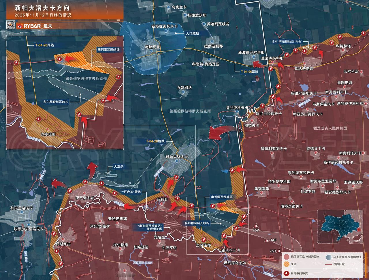 🚩新帕夫洛夫卡方向 2025年11月12日日终的情况 在新帕夫洛夫卡方向,俄军北部集群正从莫洛杰茨科耶发起进攻,向新波德戈罗德诺耶东部边缘推进。南部集群的部队正在清剿数月前在达奇诺耶周边形成的"口袋区"。 ❗️控制该地区将使新帕夫洛夫卡以南战线得以拉平,并保障菲利亚地区的侧翼免受乌军可能发起的反击。据部分消息称,俄军已从南部进入新帕夫洛夫卡,但该段战线的具体态势仍被"战争迷雾"所笼罩。