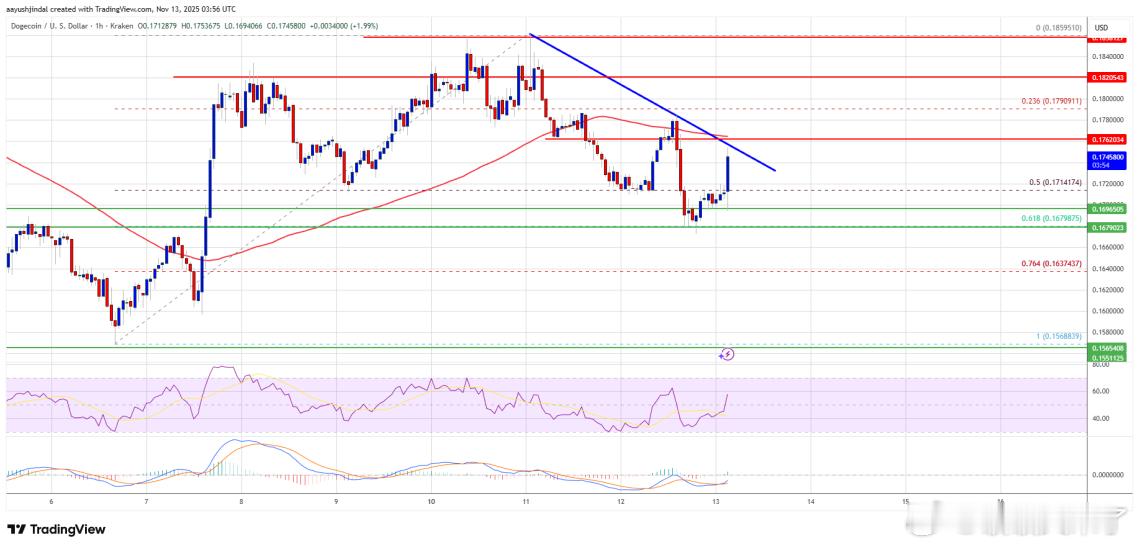 🐶 狗狗币回落,但支撑稳住,多头仍有机会最近狗狗币( )价格回落,兑美元一度跌破0.1780美元,但好在守住了0.1680美元支撑位📈,多头仍在关键价位附近活跃,有望迎来新一轮上涨。技术面显示,DOGE目前低于0.1760美元和100小时均线,小时图上看跌趋势线形成,阻力在0.1760美元。如果能突破这一水平,多头可能先冲击0.1820美元,再瞄准0.1880美元。若收盘高于0.1880美元,价格甚至有机会触及0.1920美元或0.20美元心理关口。下行方面,如果未能突破0.1820美元,价格可能回落至0.170美元,进一步支撑在0.1680美元附近,再下则可能探至0.1640美元,最坏情况下甚至下探至0.1550-0.1520美元区域⚠️。总体来看,DOGE正处于下跌修正阶段,但支撑位稳固,多头仍有机会。如果关键阻力突破,或将迎来新一轮上涨;否则短期仍需警惕回调风险。币圈小伙伴们,关注支撑阻力和技术指标再行动最稳妥😉。