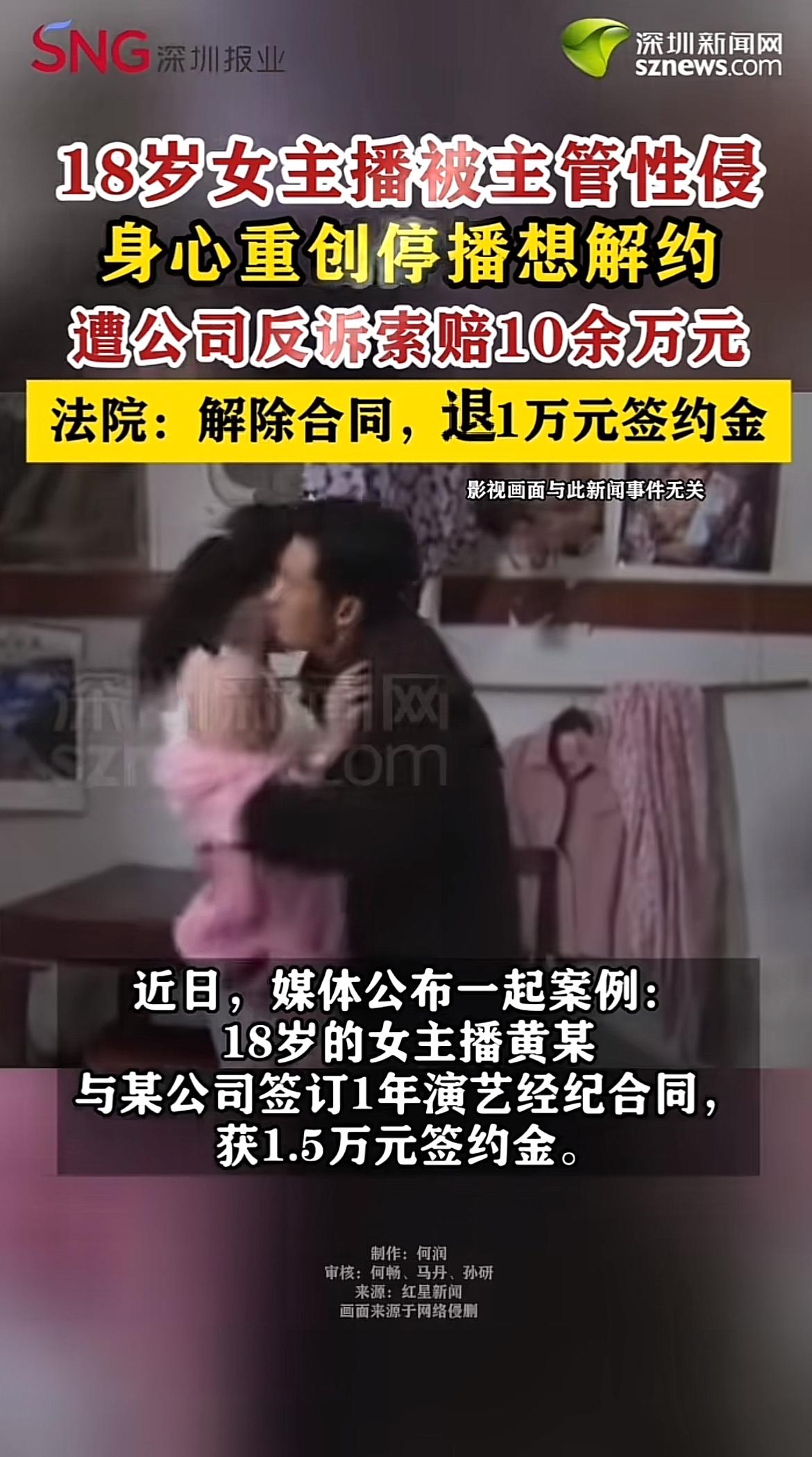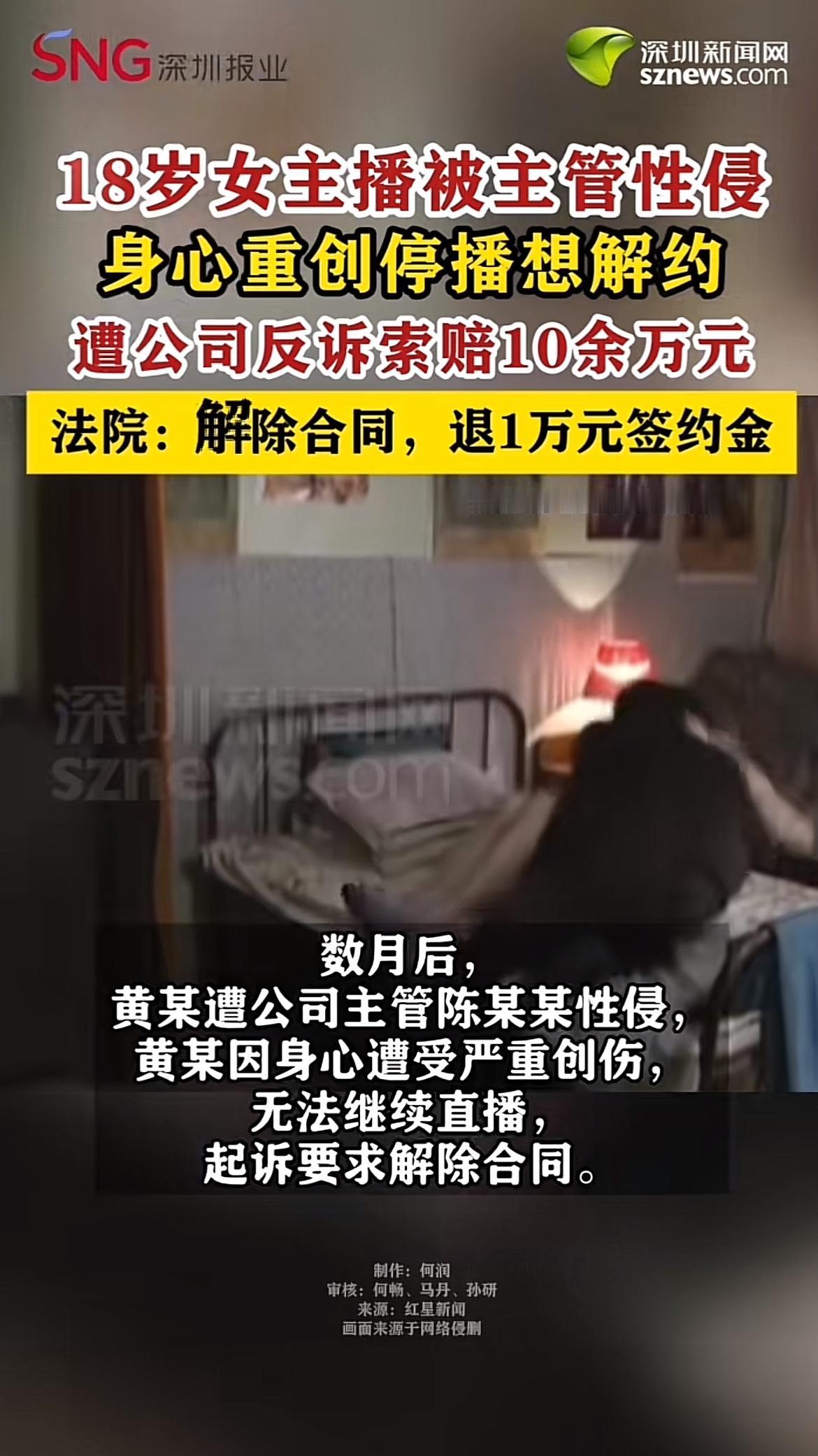 河南18岁女主播黄某的遭遇太让人气愤了。她怀揣梦想签约直播公司,本以为能开启美好事业,公司承诺包装推广还分三期给1.5万签约金。然而6月27日,公司主管陈某某以谈工作为由约她出去并实施性侵。她果断报警,罪犯被批捕。 可公司的做法令人寒心,不但没安慰,还反诉她违约,索赔10万违约金等费用。好在法院认定性侵属重大意外伤害,驳回了违约金和律师费诉求,不过黄某要退回1万签约金。这一案件引发大家对直播行业劳动保护的讨论,公司管理松散难辞其咎,希望此类悲剧不再发生。