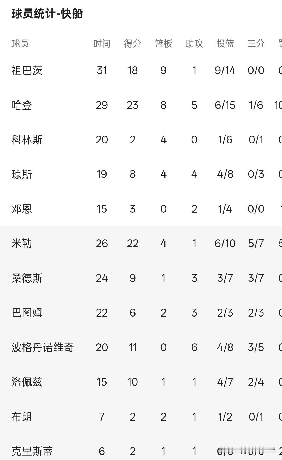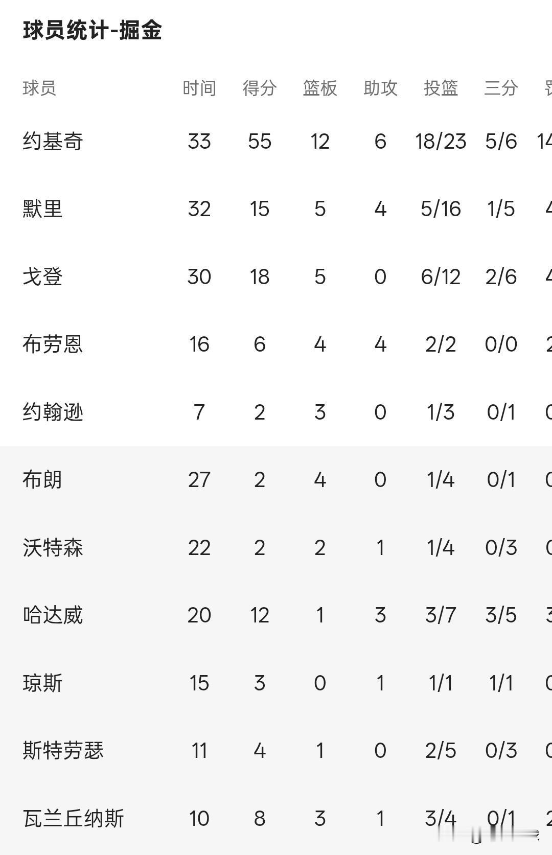 约基奇55分12板6助,掘金130-116送快船六连败。快船队上半场领先,掘金队第三节打出一波43-22反超,掘金130-116胜出,快船队吃到一波6连败排名西部倒数第四。 约基奇出场33分钟23投18中,其中三分球6投5中,罚球16投14中,得到55分12板6助攻1抢断1盖帽,约老师完全统治比赛。快船队哈登砍下23分8板5助。