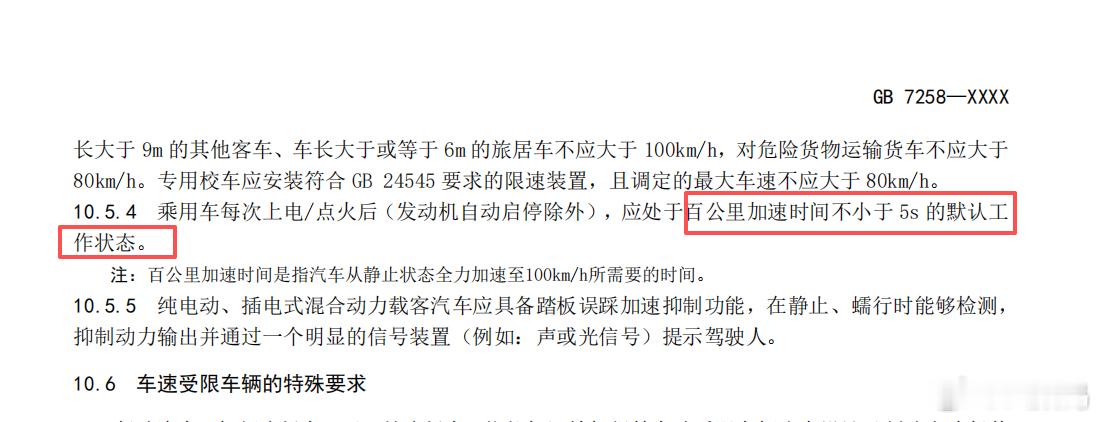 公安部起草的国标《机动车运行安全技术条件》征求意见稿看了,个人非常支持这一国家标准的实行。但那些以此来带小米节奏的还是省省吧!就几个关注点简单解读一下。10.5.4 乘用车每次上电/点火后(发动机自动启停除外),应处于百公里加速时间不小于 5s 的默认工作状态。注:百公里加速时间是指汽车从静止状态全力加速至100km/h所需要的时间。这一条关键点有两个,一个是启动后百公里加速时间不小于5s,另一个是默认工作状态下。我理解以后车子启动,必须强制开启限制动力模式,比如“标准模式”,要切换高性能模式,只能每次都要切换一下。非常欢迎这一条,对于新手误操作有限制作用。但,此条并非一刀切,完全限制家用车的性能,只是关注启动时的默认状态下现在动力。
