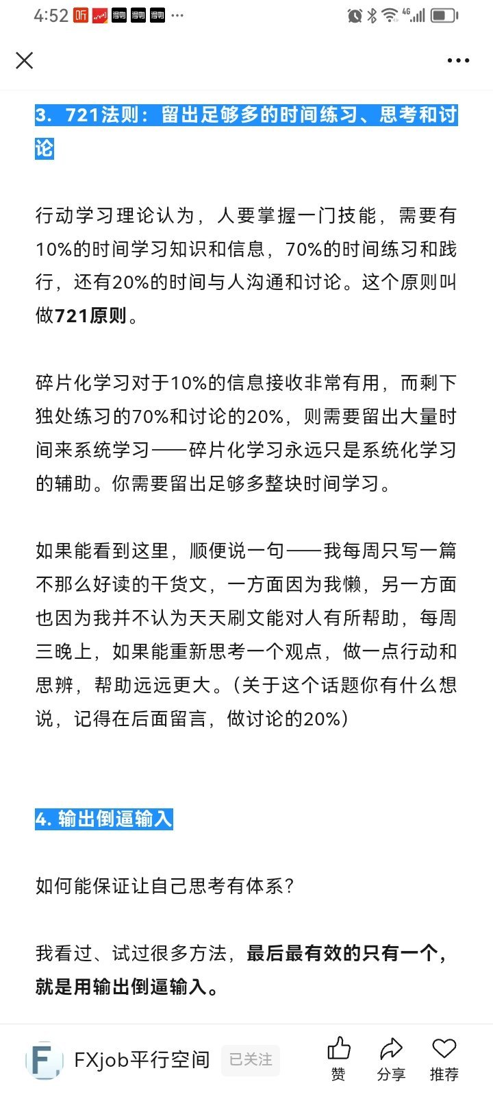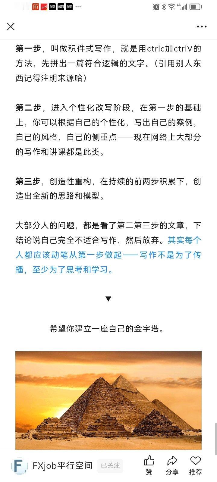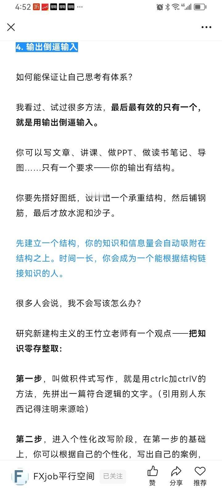 如何能保证让自己思考有体系?我看过、试过很多方法,最后最有效的只有一个,就是用输出倒逼输入。你可以写文章、讲课、做PPT、做读书笔记、导图……只有一个要求——你的输出有结构。你要先搭好图纸,设计出一个承重结构,然后铺钢筋,最后才放水泥和沙子。先建立一个结构,你的知识和信息量会自动吸附在结构之上。时间一长,你会成为一个能根据结构链接知识的人