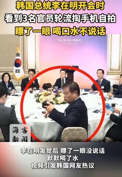 李在明开会时3名官员轮流自拍,韩国总统开会变自拍局! 昨天李在明在总统府开中央地方合作会议,正讨论国计民生呢,3名官员竟接连掏手机自拍“打卡”,把严肃会议当成网红景点。 李在明发觉后就淡淡瞟了一眼,默默喝口水没说话,那表情像极了“打工人看同事摸鱼却懒得管”。 韩国政治圈是够离谱了,官员开会心思全在自拍上,国家大事搁一边。这哪是履职,分明是把公职当网红体验卡!你见过这么荒谬的政务现场吗?