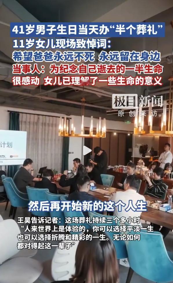 “半个葬礼”,不是消极落幕,而是主动清零过往,以轻盈姿态奔赴下一段旅程,活出新生!北京 41 岁王先生在生日当天举办“半个葬礼”,以脱口秀形式告别前半生,还请 11 岁女儿念悼词,50 多位亲朋参加。 41 岁生日当天蹲在 "棺材" 里念墓志铭的王先生,可能解锁了中年人对抗精神内耗的新方式。看他的直播回放挺有意思 —— 花式碰瓷自己的交通事故经历,还不忘揶揄职场瓶颈期的中年状态。最绝的是跟 11 岁女儿的字句博弈,每写够三百字悼词奖励三百块,这是把生死教育玩成了付费创作。 现在白领圈流行离职开 "葬礼",文旅博主热衷废墟写生。与其说是在对抗死亡焦虑,不如说是集体陷入了存在主义打卡模式。隔壁日本作家三浦展去年还活着就出讣告,韩国爱豆权志龙把生日趴办成花葬巡游,纽约名流都开始预定生前告别派对场地。当代人连生死仪式都要卷出行为艺术。 不过王哥这招确实点醒我,花 15000 天给自己办个述职报告,比深夜朋友圈 emo 体面得多。但建议下次别让闺女带货悼词了,毕竟有我闺女至少开价10元 / 字啦。
