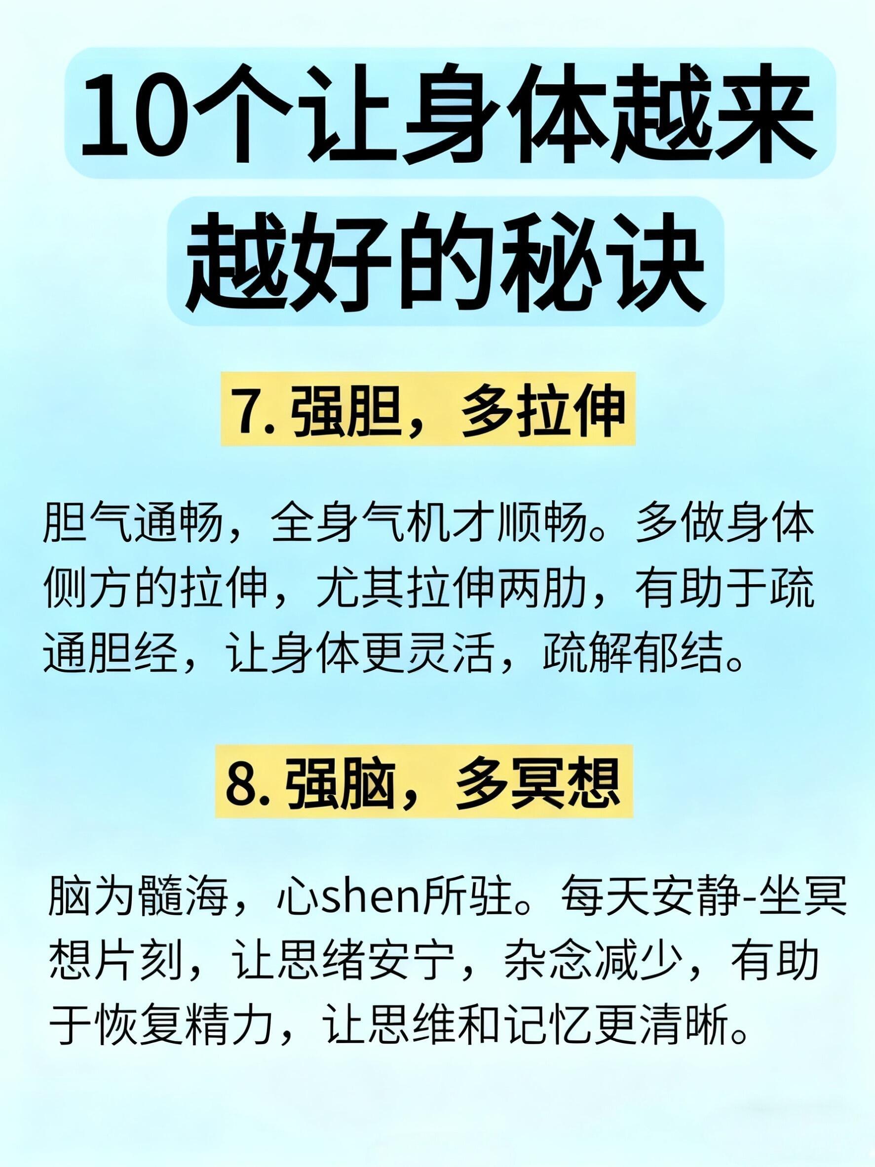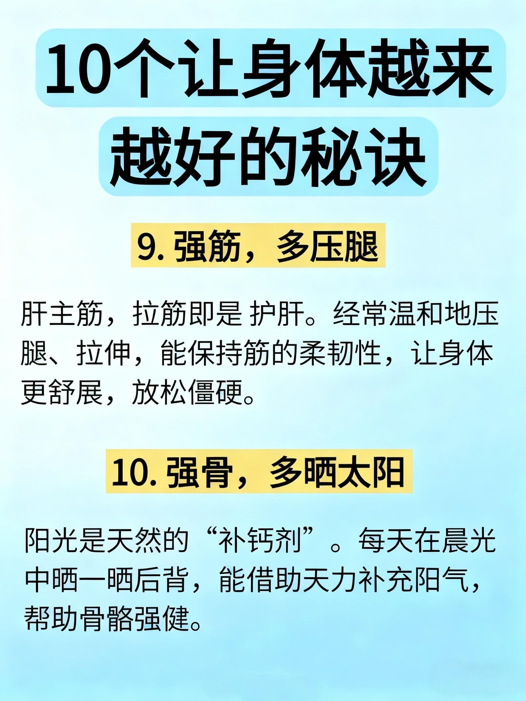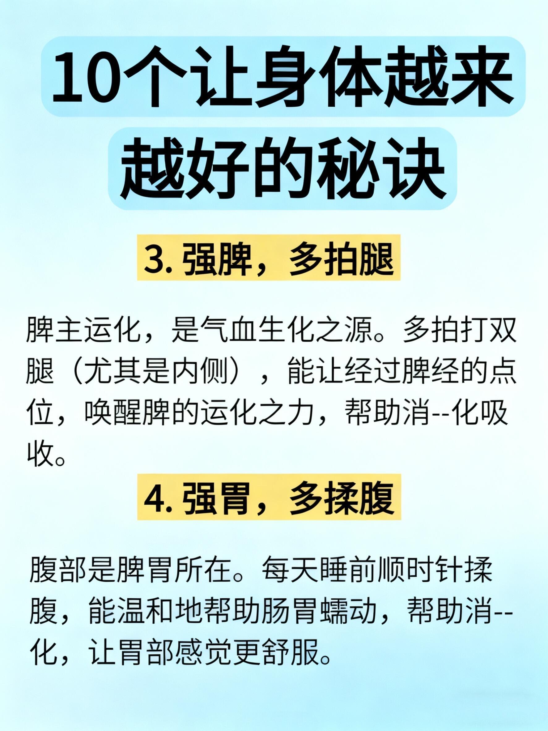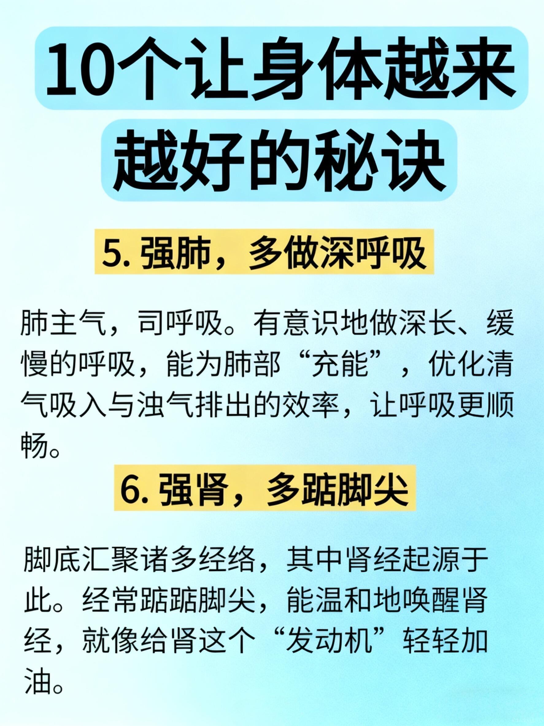 十个让身体越来越好的秘诀‼️1.💖活力心肺|每日跳绳几分钟高效带动气血,让心肺更有力,为全身注入活力2.🌿舒畅心情|每日散步护肝脏帮助气机通畅,减轻肝脏压力,让情绪自然放松~3.🦵健脾助运|常拍双腿内侧唤醒脾经运化之力,助力身体消化与吸收4.🤲和胃舒缓|睡前顺时针揉腹帮助肠道蠕动,让胃部感觉舒适,改善消化5.🌬️深长呼吸|为肺部有效充电帮助气体交换,让呼吸更深入、更顺畅自然~6.🦶激发肾气|简单踮脚动作温和活跃肾经,为身体根基补充能量7.🧘疏通胆经|多做侧方拉伸舒展两肋,让身体更灵活,帮助气机平衡~8.🧠安神静心|每日冥想片刻让思绪沉淀,精神内守,思维记忆更清晰9.🦵柔韧筋络|经常压腿拉伸舒展身体筋膜,保持弹性,让动作更协调~10.☀️坚固骨骼|晨光中晒后背借助阳光能量,帮助身体合成所需营养