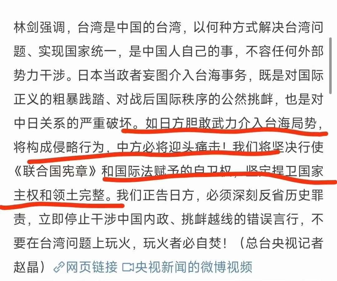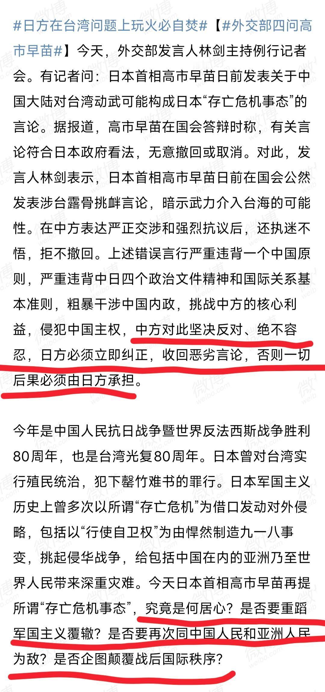 外交部定性了:这是侵略,中方必将迎头痛击! 对于高市早苗拒绝撤回其涉台海挑衅言论一事,13日的外交部记者会上,发言人林剑再度做出了回应。这一次,我们的话说得非常重,用词也是近年来相当罕见的。 对于高市将承担一切后果。早苗拒绝撤回言论的行为,我们表示“绝不容忍”,并且警告称,日方若不纠正错误言行,则必将承担一切后果。 而对于高市早苗的言论本身,我们对其发出了振聋发聩的4问,并且发出了堪称近年来最严厉的警告:如果日方胆敢武力介入台海局势,将构成侵略行为,中方必将迎头痛击!我们将坚决行使自卫权,坚定捍卫国家主权和领土完整。如日方武力介入台海中方必将迎头痛击 这话是什么意思,相信每个人都懂。用前台北县长周锡玮的话说,高市早苗必须想清楚,再这么作下去,那她只能自取其辱,甚至日本可能将亡国。这恐怕就是今天外交部回应中的更深层含义。 更多的话,相信也不用说了,“打败日本侵略者”,是刻在每个有良知的中国人DNA里的东西,既然日本人在80年后又想当一次“侵略者”,那我们也一定会再打败他们一回!