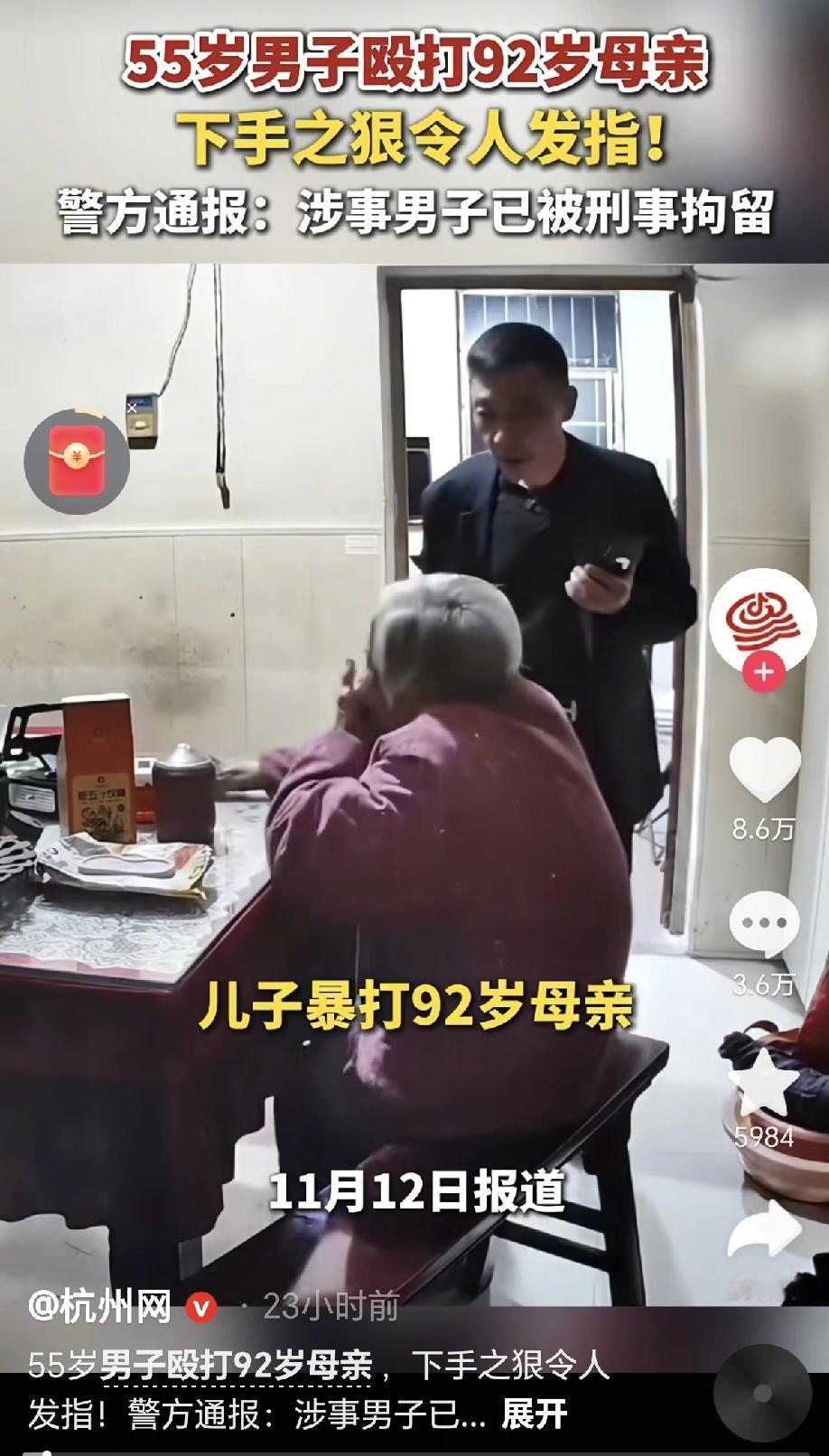 55岁的儿子对92岁老母亲拳打脚踢!警方通报刚出来,这事儿结局看得人心里又酸又气… 视频里,他扬起拳头砸向老人的那一刻,整个网络都炸开了锅!让人想不通的是,动手的是自己亲儿子,被打的却是93岁的老母亲。最新情况是,打人的杨某中已经被警方依法刑拘了,老人现在已经被其他亲戚接过去照看着了。 看到通报里写着“因为一点小事吵了几句”,心里头就像压了块大石头喘不过气。92岁的老人能犯啥错啊?就算两家有矛盾,当儿子的又怎么能下得去打老人的手呢?就像网友说的,这种人啊,根本没资格当人儿子! 现在倒好,自己把自己送进了看守所。依我看啊,这种人就该多判几年!但更让人揪心的是老人以后的日子怎么过,就盼着亲戚们能真的好好照顾她。你们觉得,这种不孝的儿子,是不是该跟他彻底断绝关系?
