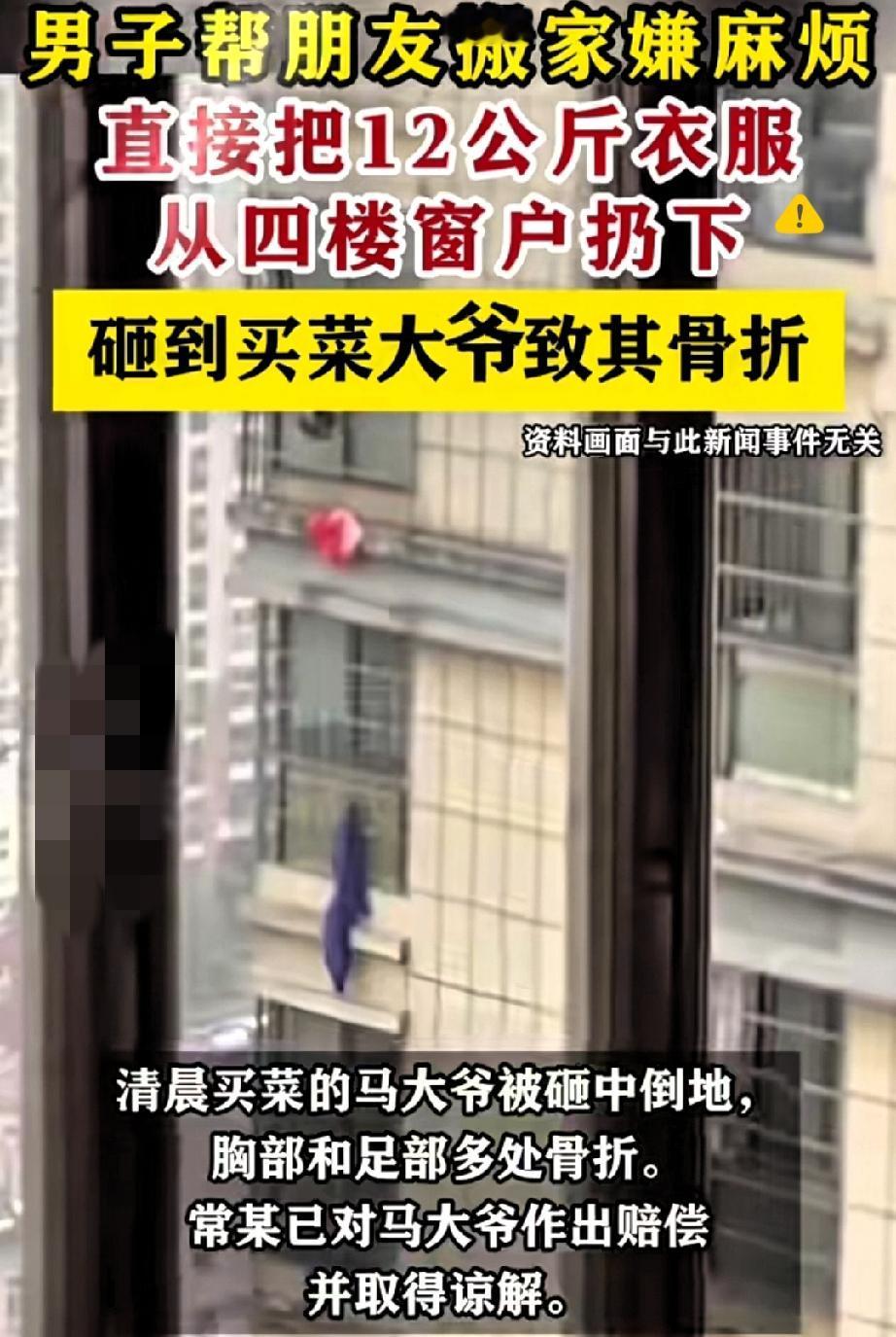 谁能想到帮朋友搬家还能闯下弥天大祸? 男子嫌扛12公斤衣服下楼麻烦,直接从4楼往下扔,刚好砸中路过买菜的大爷,直接导致大爷骨折。 好心帮忙本是好事,可这“怕麻烦”的操作简直让人窒息。 既然答应帮忙,就该尽心尽责,嫌累嫌麻烦大可以提前说,何必用这种危险方式图省事? 这下倒好,自己要赔钱又要照顾人,还把朋友拖下水,好好的搬家变成了“闯祸现场”。 最无辜的还是大爷,出门买个菜就遭了无妄之灾,换谁都得糟心。 其实比起坏人,这种“没脑子”的蠢操作才更让人防不胜防。 坏人的坏藏在明处,可蠢人的危险往往裹着“无心之失”的外衣,最后却要别人为他的草率买单。 交友真的要擦亮眼睛,远离那些缺乏安全意识、做事只顾自己方便的人,不然哪天被连累都不知道。 你身边有没有遇到过这种“好心办坏事”的人?评论区说说你的经历~