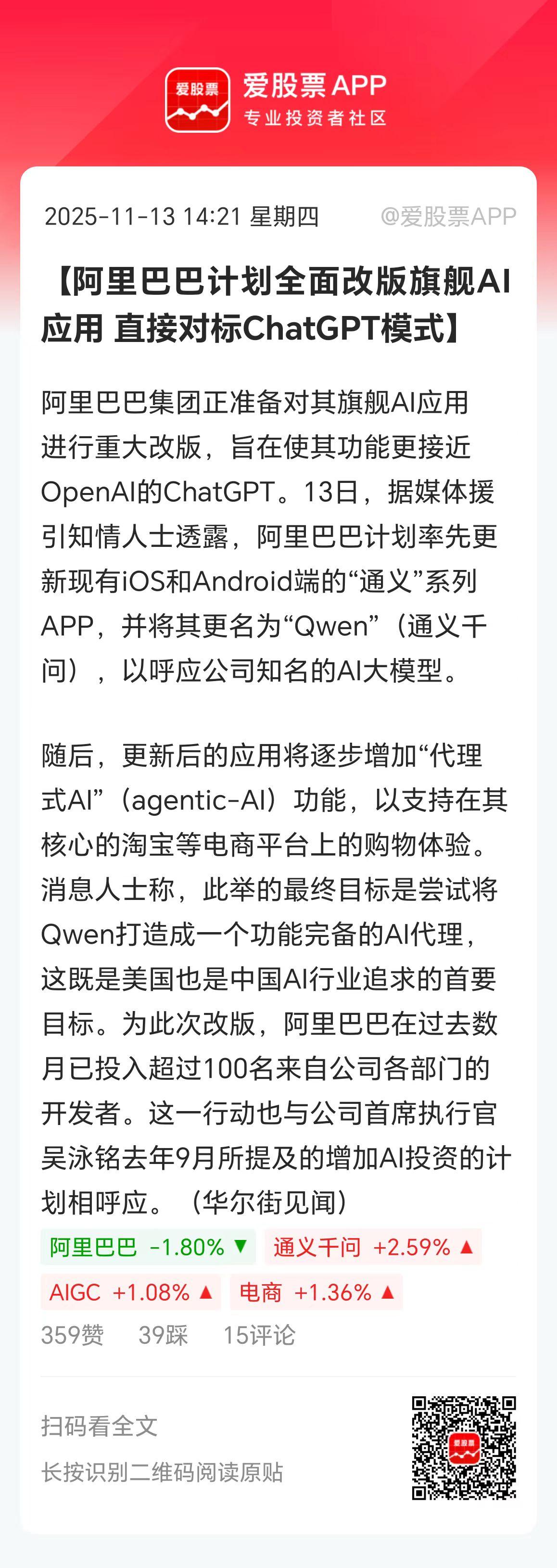 今天午后阿里巴巴突然猛拉,一己之力带动港股翻红!也带动A股阿里概念股狂飙,值得买20CM涨停,三江购物、数据港等多股涨停。 原因是媒体报道,阿里巴巴已秘密启动“千问”项目,全面对标ChatGPT,加入全球AI应用的顶级竞赛。 记者就此事询问阿里巴巴,公司回应是“未予确认”。但这恰恰留给市场想象的空间:“没有否认,就等于可以当故事讲了”! 大家都知道,阿里巴巴一直在“All in AI”,年初就公布3800亿元投入AI基础设施,股价也直接翻倍。但最近几个月阿里疯狂搞外卖补贴,据说已经砸了300亿,很多投资者并不认,股价也阴跌了一个月。 关键时刻还是靠AI可以救主,不得不说,阿里还是挺会做市值管理的。但这也表明了,阿里巴巴要做中国的OpenAI,大家是比较认可的,他有这个实力,也应该有这个担当! 爱股君想说,国内AI行业,阿里巴巴应该去当带头大哥,一是Qwen大模型性能跻身全球前三;二是阿里是C端巨无霸,整个生态(电商、本地生活、文娱等)有被AI赋能的强大协同效应。 总之,马云都回来了,阿里的征程应该是星辰大海。把AI给搞起来,而不是在外卖补贴里赚一点小钱。 对A股来说,阿里大模型全面对标ChatGPT,面向C端,会加速AI应用时代的到来!下游国产软件、云计算、AI应用这些重点关注下!