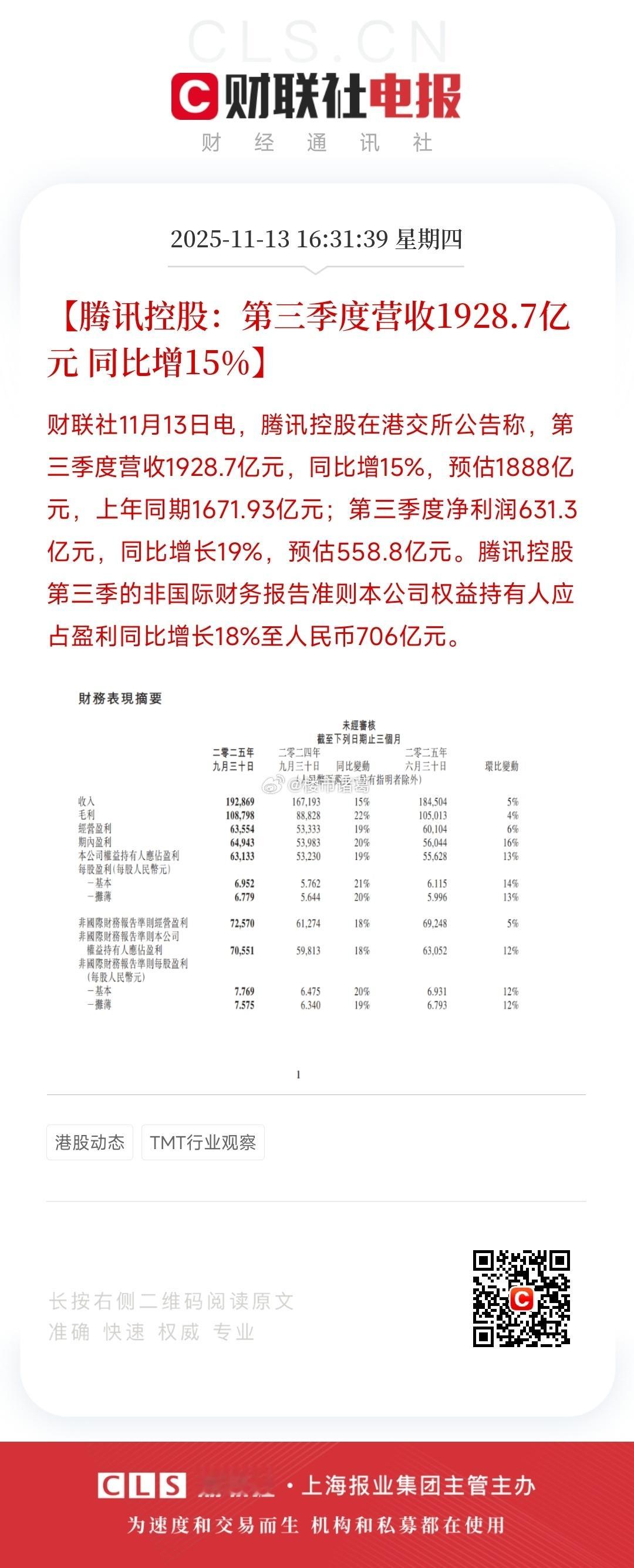腾讯公布财报,第三季度营收达到1928.7亿元人民币,同比增速15%净利润631