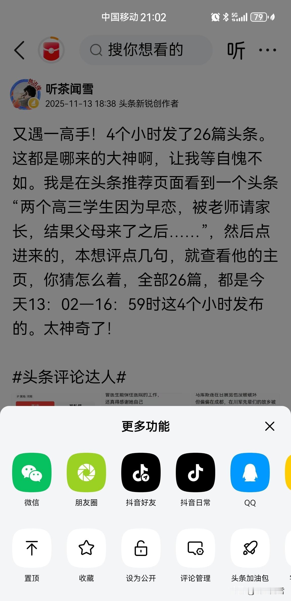 “怪事”又来了!平台宕机了?还是被我戳中平台痛处了?下午16:38时发出一个微头条,2个半小时过去还在“审核中”,这可是从来没有过的事。 今天是赶上什么好日子了吗,还是这篇头条有问题?仔细看了一篇,没啥呀。除非文中有一个词可能属于违禁,就是说两个中学生谈恋爱的,可是那位发的头条能通过,为什么我用那词就不行? 更叫人受不了的是平台还不让你修改,这也太欺负人了吧。咱们很支持平台执行社区规范,可社区规范也得一视同仁吧。再不行你发个审核通知告诉我删了也行啊。 朋友们!我该怎么办?