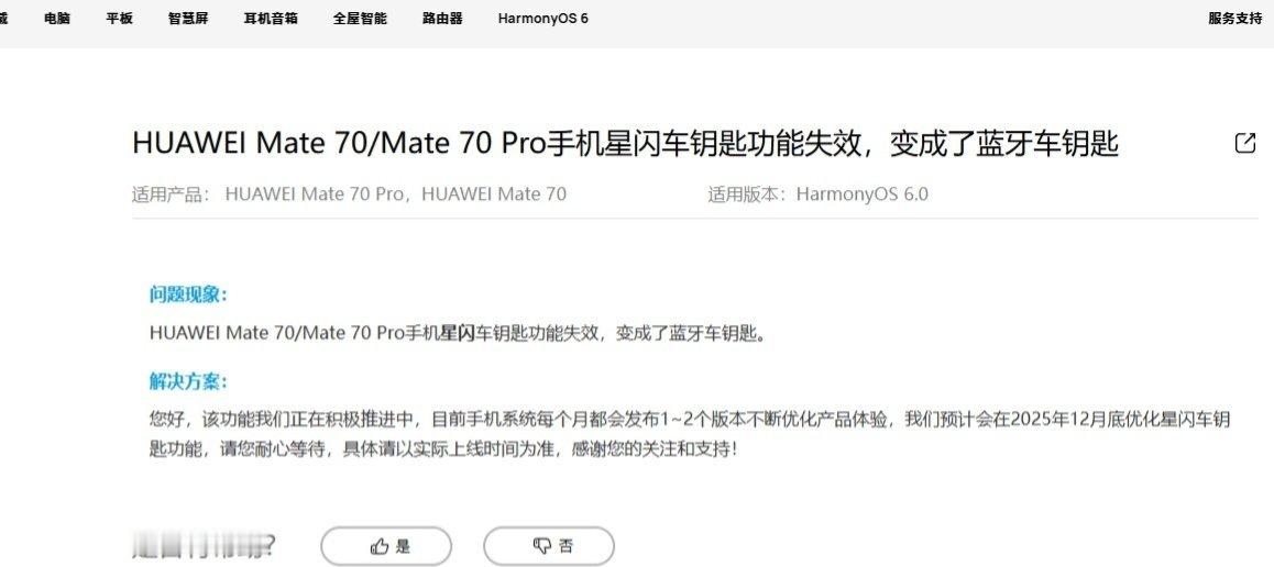 【华为 Mate 70 / 70 Pro 手机星闪车钥匙功能失效,预计今年 12 月底优化】华为官网“手机星闪车钥匙使用帮助说明”显示,手机星闪车钥匙已在鸿蒙 HarmonyOS 6 系统版本落地,适配机型包括 Mate 70 系列(部分)、Pura X 系列等。开通手机星闪车钥匙条件如下:手机星闪车钥匙:支持机型及系统版本 HarmonyOS 5.1 及以上版本:Pura 80 系列,Mate XTs,Mate 70 AirHarmonyOS 6.0 及以上版本:Mate 70 RS| ULTIMATE DESIGN,Mate 70 Pro+,Pura X 系列,nova 14 Pro,nova 14 Ultra支持车辆 :尊界:S800享界:S9 增程版、S9T尚界:H5华为官方正在积极推进该功能,目前手机系统每个月都会发布 1~2 个版本不断优化产品体验,预计会在 2025 年 12 月底优化星闪车钥匙功能,具体请以实际上线时间为准。据介绍,星闪车钥匙通过测量信号的“相位心跳”(相位差)和“飞行时间”,能在复杂环境下绕过环境干扰,实现分米级精准定位,解决传统数字车钥匙“定位飘”的长期痛点,还能识破中继攻击;支持精准迎宾(随时感知车主到来)、无感上车(走近即解锁,拉门即启动)、自动落锁升窗特性。