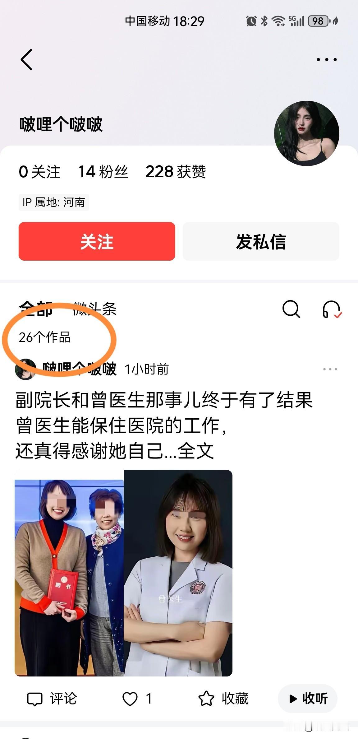 又遇一高手!4个小时发了26篇头条。这都是哪来的高人啊,让我等自愧不如。我是在头条推荐页面看到一个头条“两个高三学生因为Z恋,被老师请家长,结果父母来了之后……”,然后点进来的,本想评点几句,就查看他的主页,你猜怎么着,全部26篇,都是今天13:02—16:59时这4个小时发布的。太奇怪了吧,平台呢打盹了吗,莫非机器人也会摸鱼?好笑!