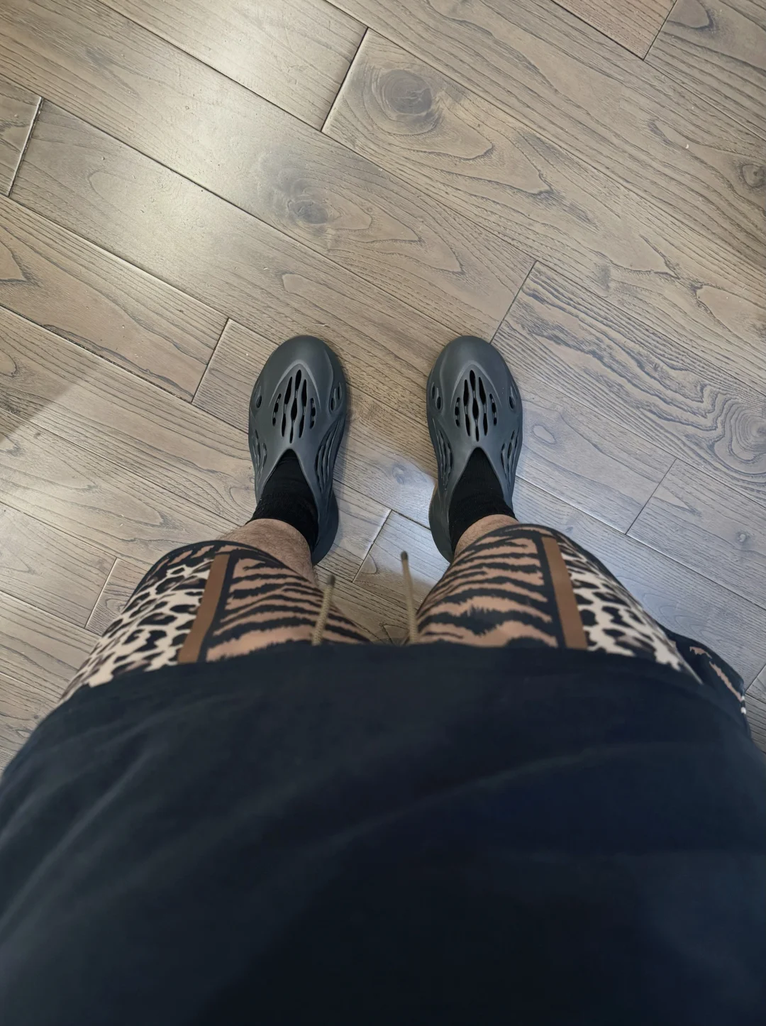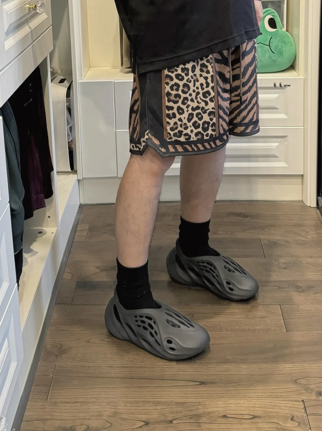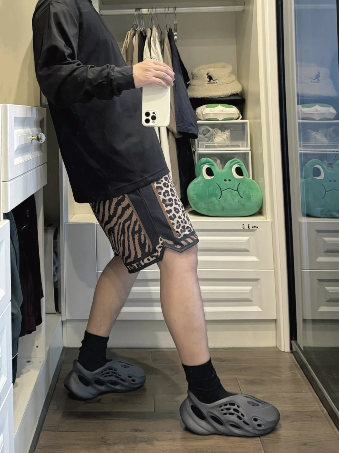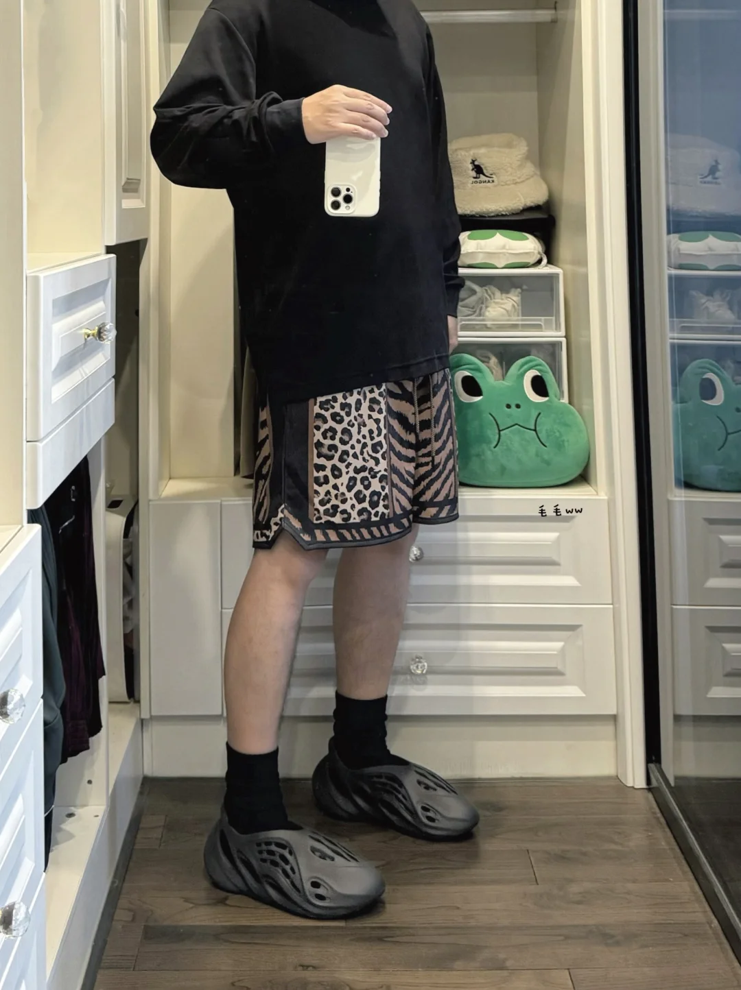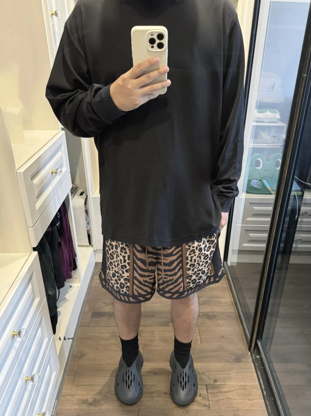-本期选择了深色系;大部分低调的黑色单品,让豹纹短裤格外显眼,不对称的细节区别于传统纹路;长袜&洞洞鞋,上长下短预热一下早秋穿搭 . —————— . 👔Uniqlo U / 465193 // XXL . 🩳Hyperkiller // XL . 👟YEEZY Foam Runner / onyx // 44.5 . —————— . ✏️本人178cm75kg 球鞋尺码265mm(正常EU42) . 💭以上均为我个人观点,不喜勿喷,欢迎讨论。