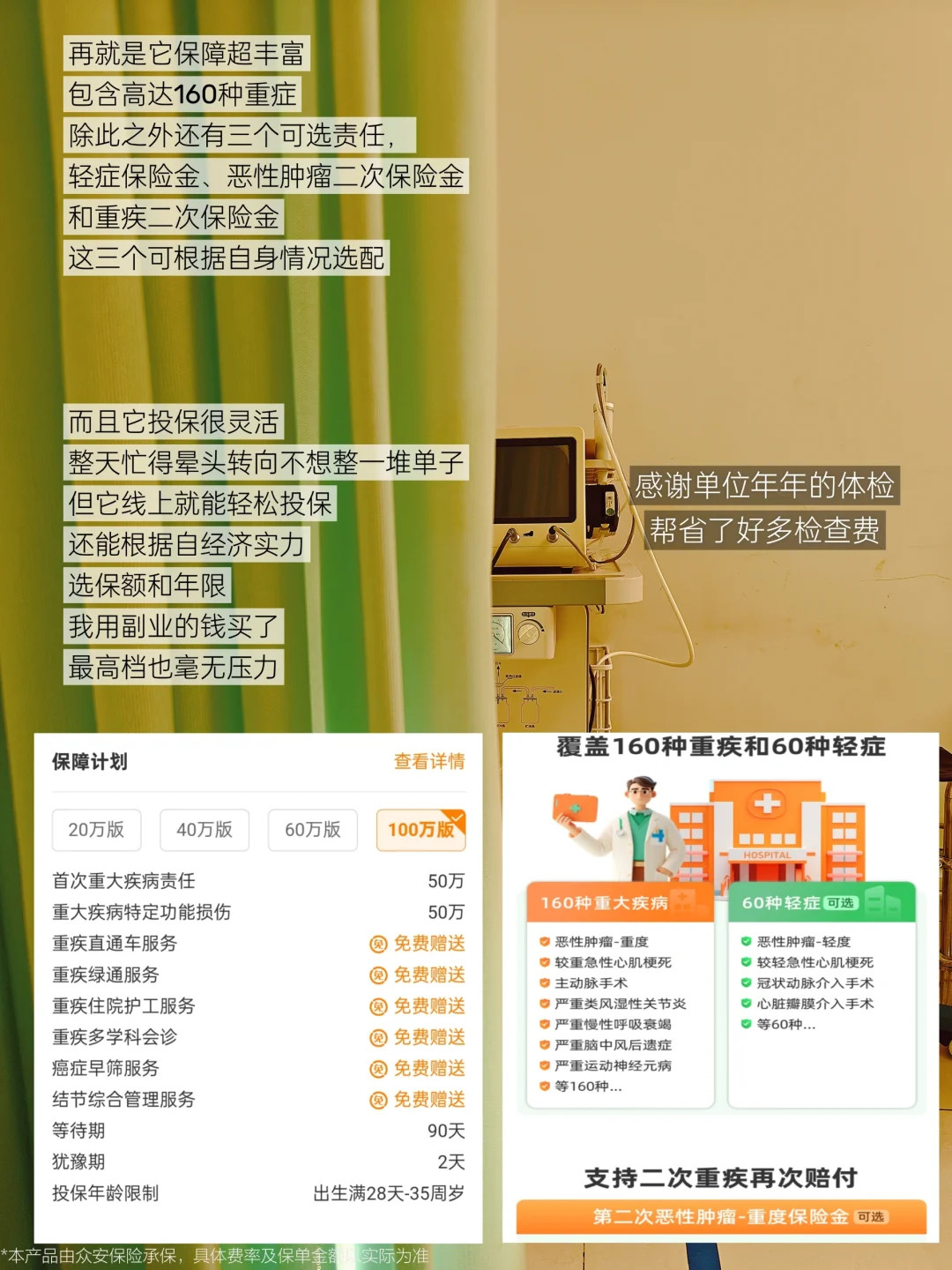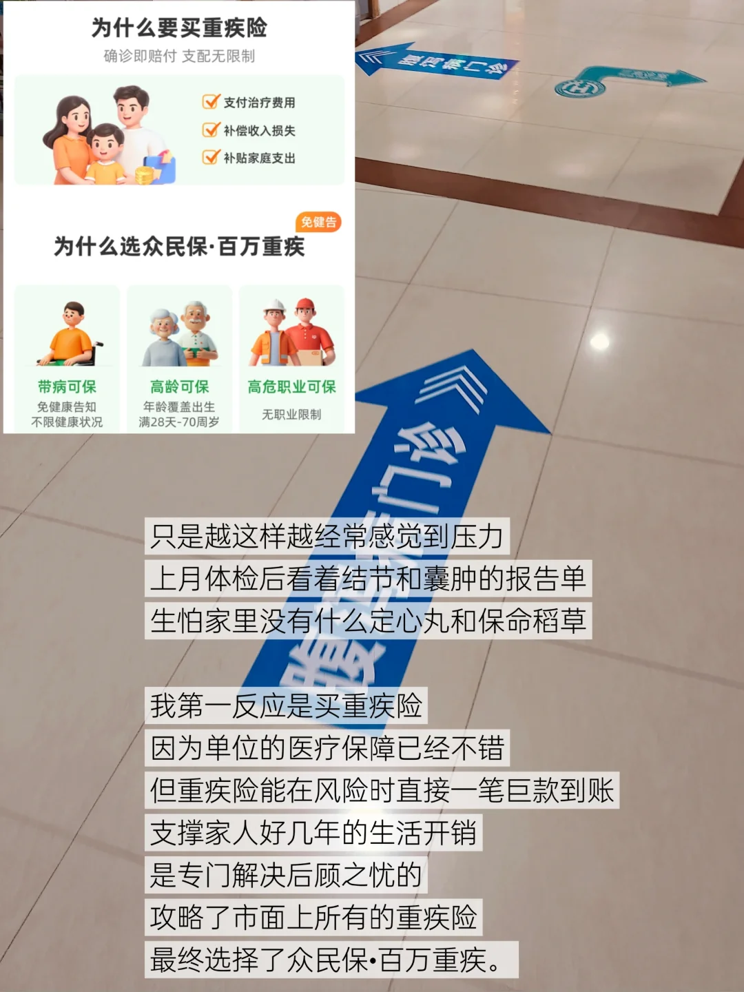只是越这样越经常感觉到压力。上有父母下有幼儿,队友还在吃大环境的苦。上月体检后,看着结节和囊肿的报告单,生怕家里没什么定心丸。我第一反应是买重疾险。因为单位医疗保障已经不错,但是重疾险能在风险时刻直接一笔巨款到账,支撑家人好几年生活开销。