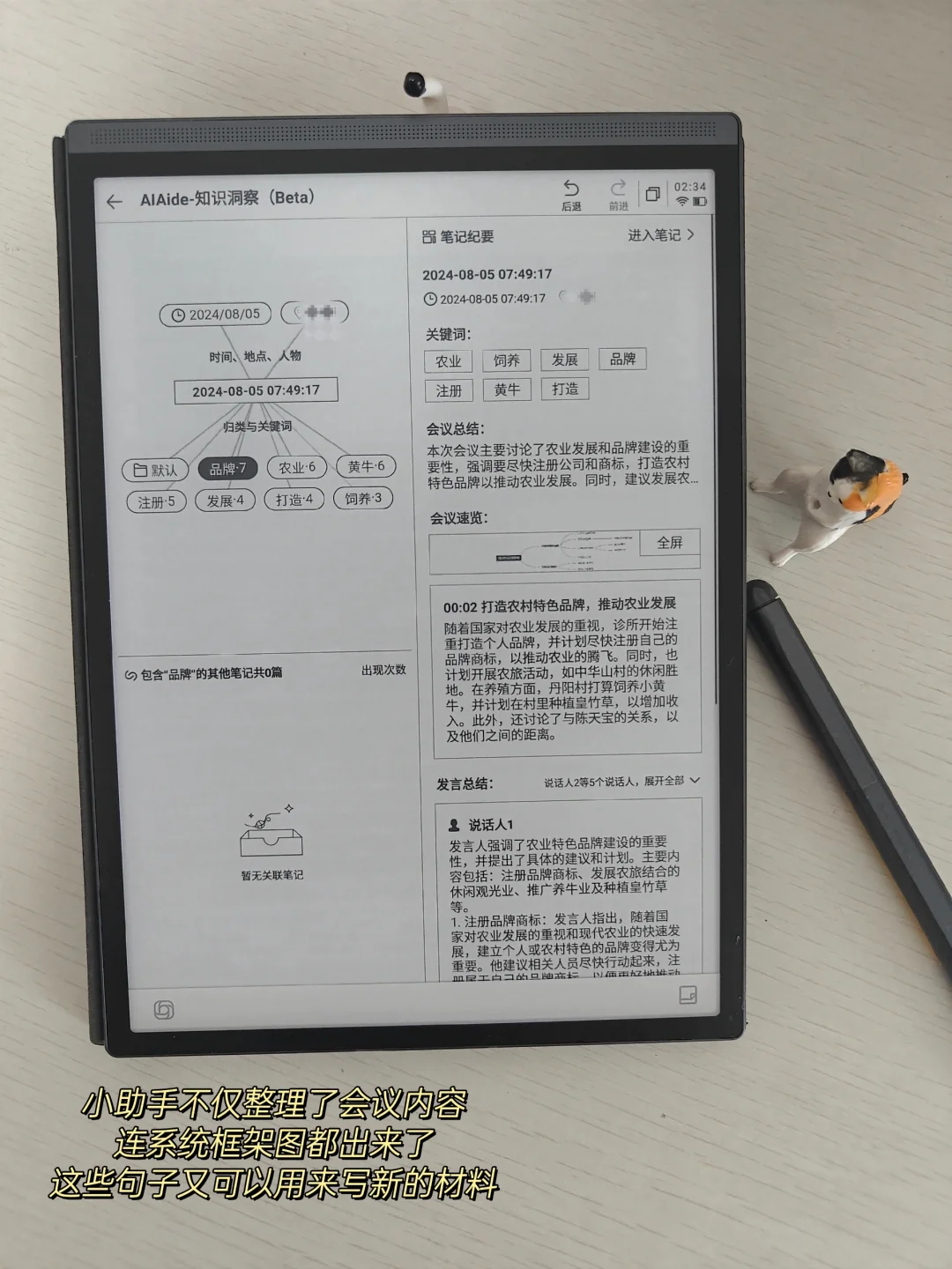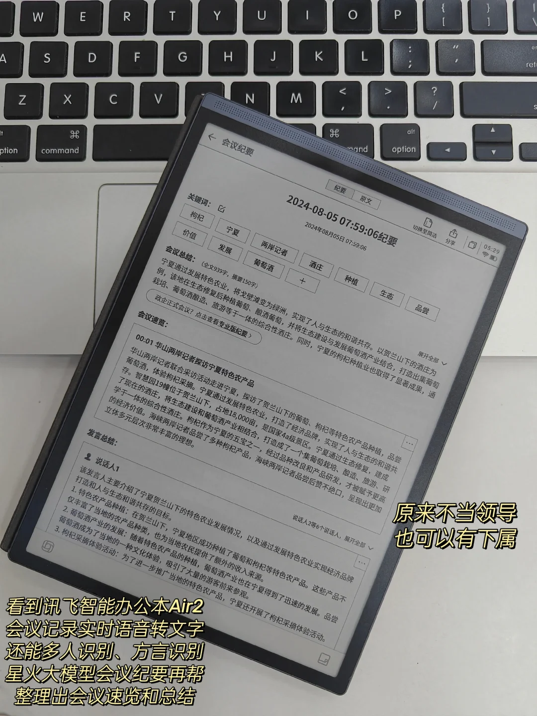 我们经常临时召开各类会议,并撰写会议纪要或宣传稿。我们都入了科大讯飞智 能办公本Air 2。3位领导在台上哗哗讲,办公本这边能实时将录音转成文字,还贴心地把领导山东方言给识别了[暗中观察R],也把3人角色给区分了!这个转文字功能免费且可离线,太方便!领导口吐新词,能立刻划线搜索词义。依托于星火大模型,会议纪要功能再帮你整理出会议速览和总结,方便跟上级汇报。好工具真的就是好下属,科技让每个人无 痛当领导。