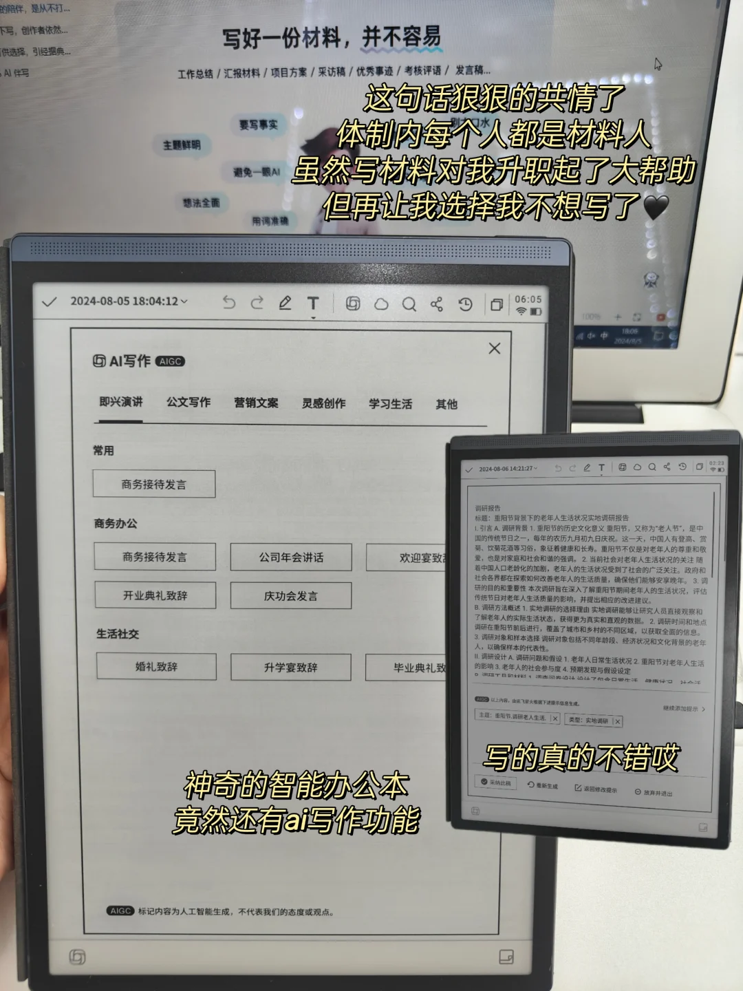 比如大领导临时交办紧急材料;签字;临时部署会议。以写材料为例。可以先用讯飞智 能办公本Air2的Ai写作功能出初稿,再充、删、润。省时省力、流程清晰。