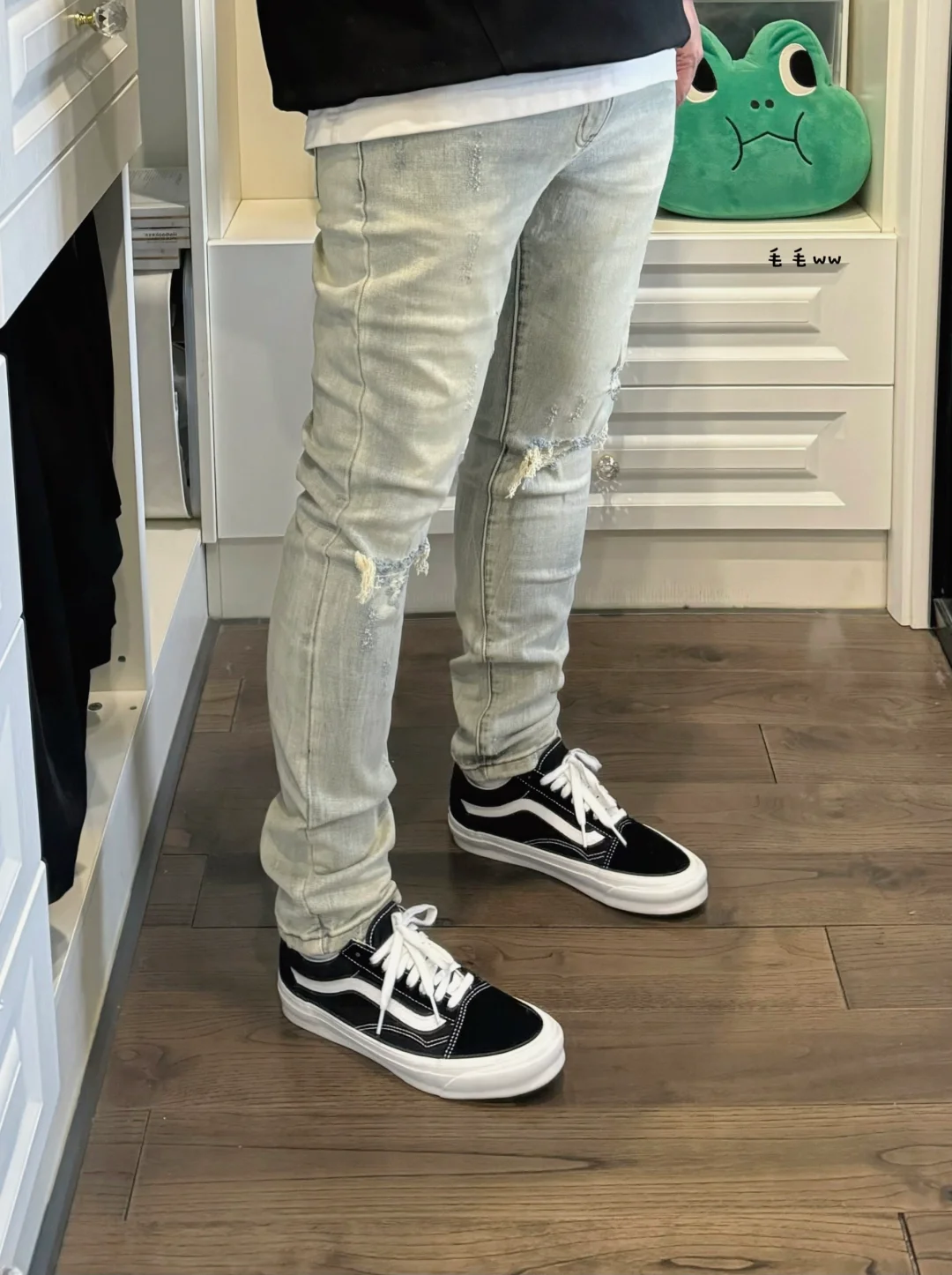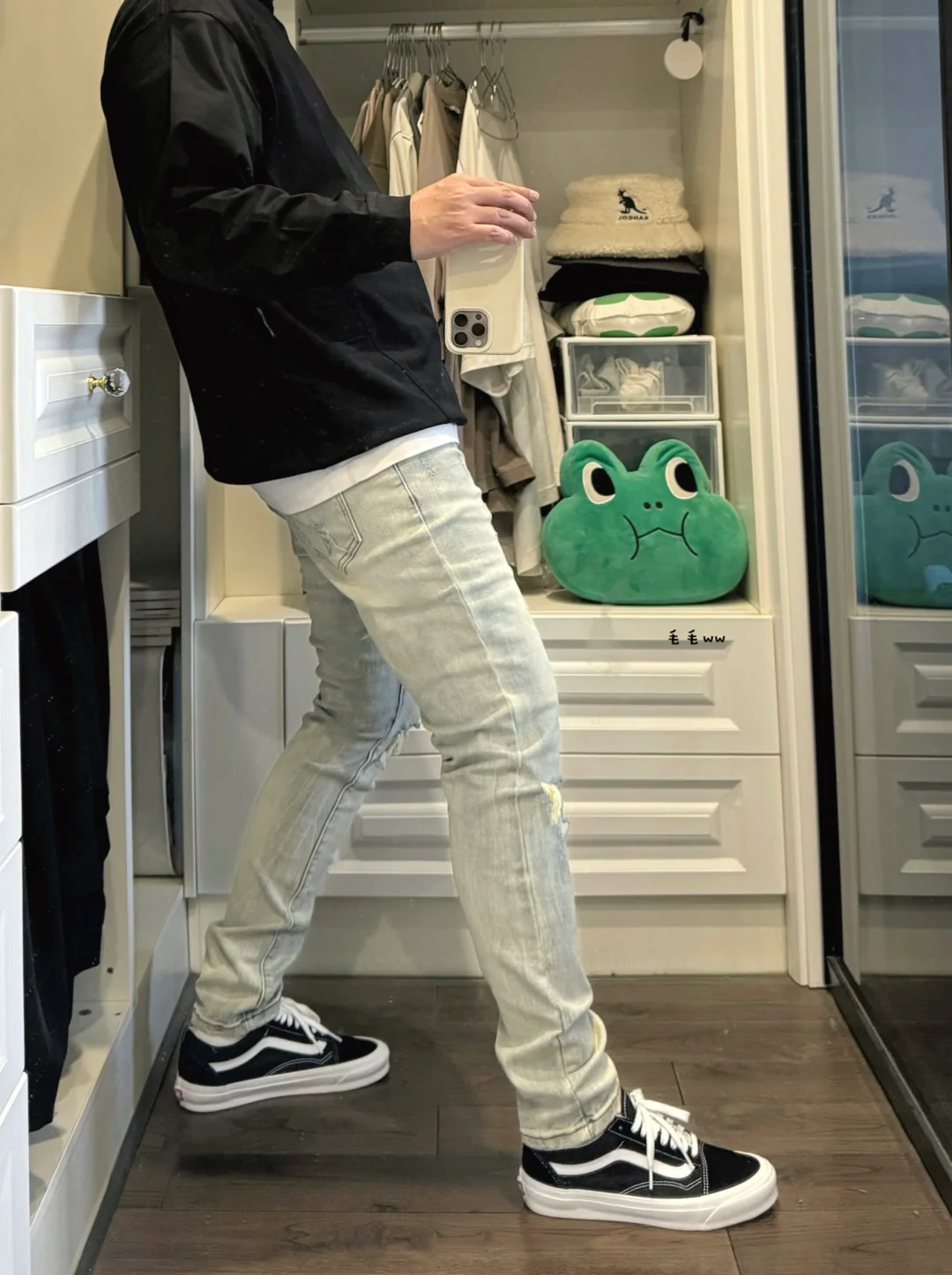 -显高显瘦的牛仔裤穿搭,挑了一条浅色的窄裤;上装配合同色的硫化鞋,鞋型也选择瘦长,搭配黑色系效果非常明显 . —————— . 👔Expensive Taste // M . 👖Profound / 做旧牛仔 // 30 . 👟VANS / Old Skool lx // 41 . —————— . ✏️本人178cm75kg 球鞋尺码265mm(正常EU42) . 💭以上均为我个人观点,不喜勿喷,欢迎讨论。
