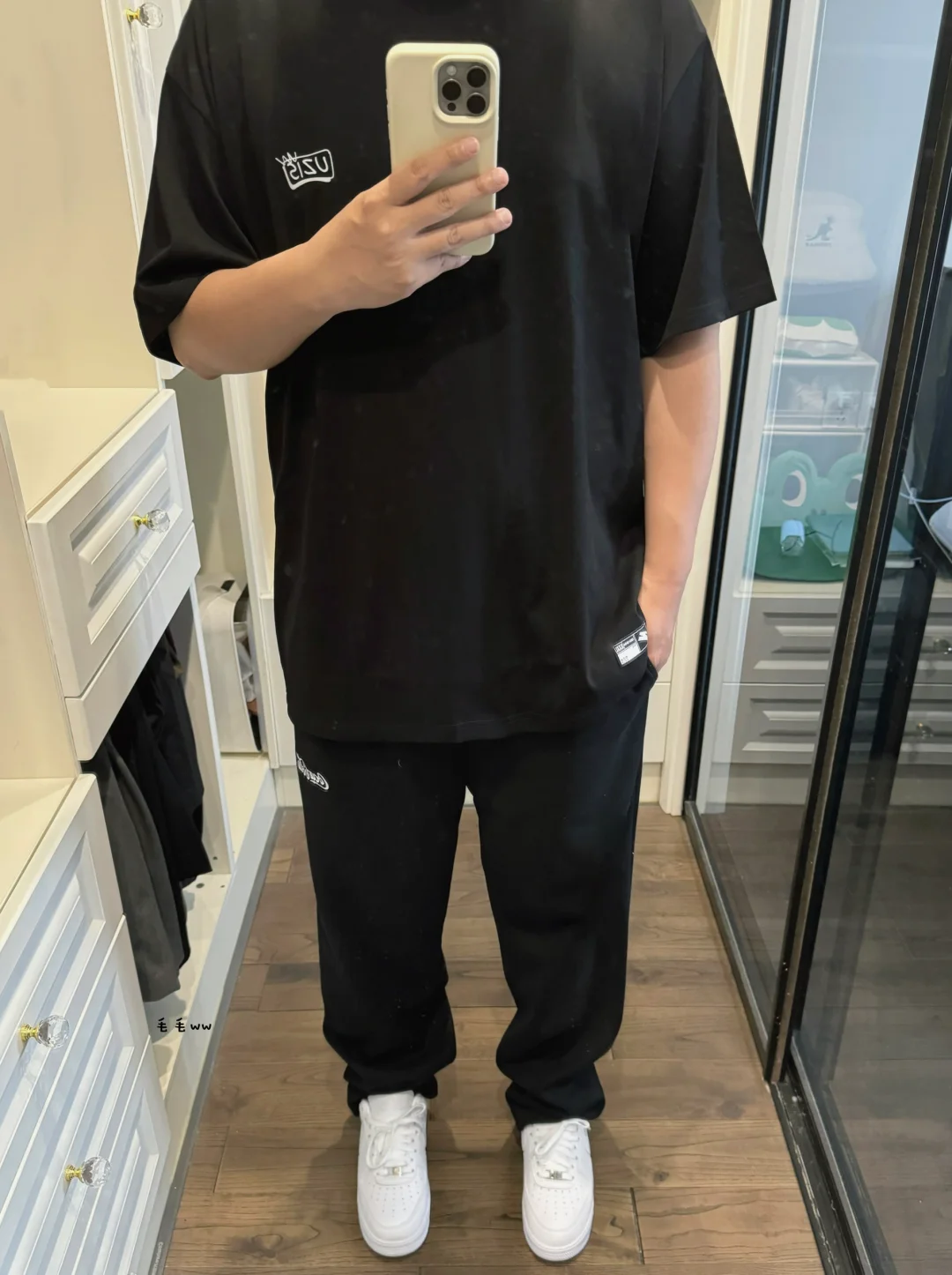 -全黑look,整体效果是真显瘦哇;速干Tee已经做的不那么贴身了,介于压缩衣跟纯棉Tee之间,日常搭配也能穿着,直筒裤小白鞋直接出街 . —————— . 👕UZIS / 畅想 // XXL . 👖Coca-Cola / 可口可乐 // XL . 👟Air Force 1 low / NOCTA // 42 . —————— . ✏️本人178cm75kg 球鞋尺码265mm(正常EU42) . 💭以上均为我个人观点,不喜勿喷,欢迎讨论。