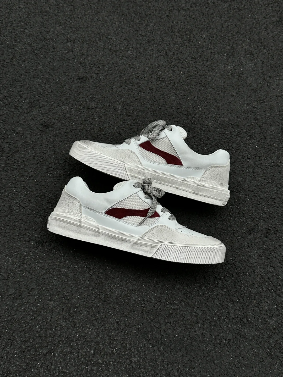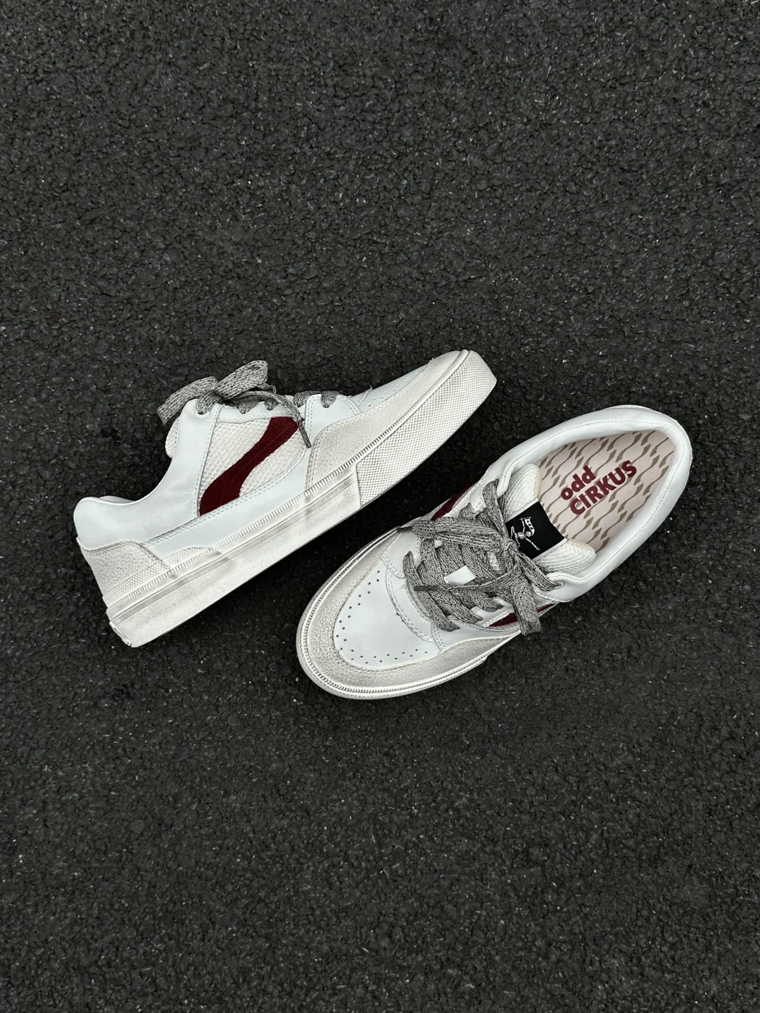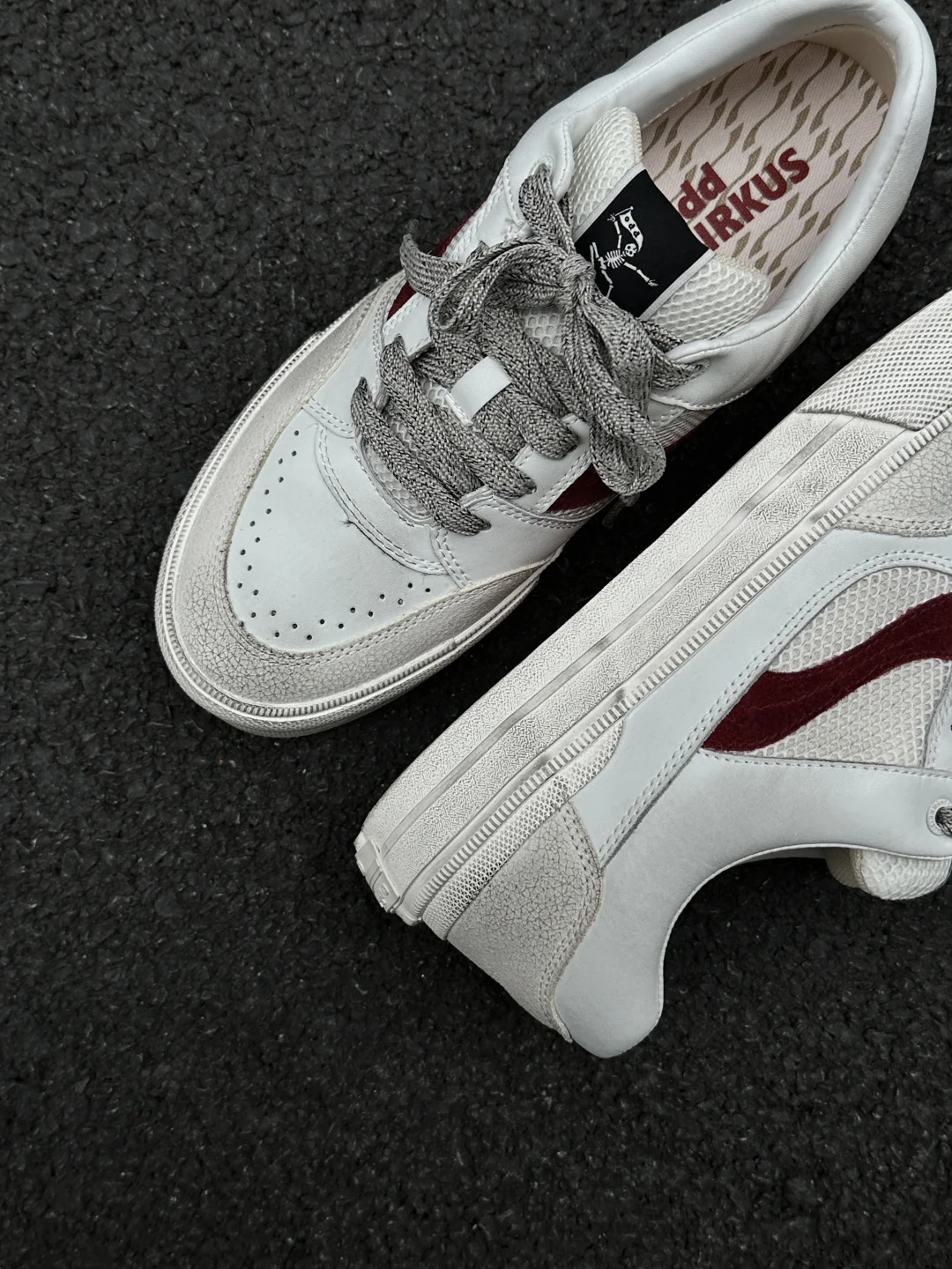 今天分享的是oddCIRKUS的脏脏鞋 拿到鞋的第一感觉是质感好棒 鞋头的龟裂纹加上鞋面的做旧处理 真的是一双街头属性点满的鞋子 通体白色的鞋面搭配点缀的红色 日常穿搭也是一个很百搭的选择 如果你还是一个热爱滑板的靓仔靓女 那只能说无脑入
