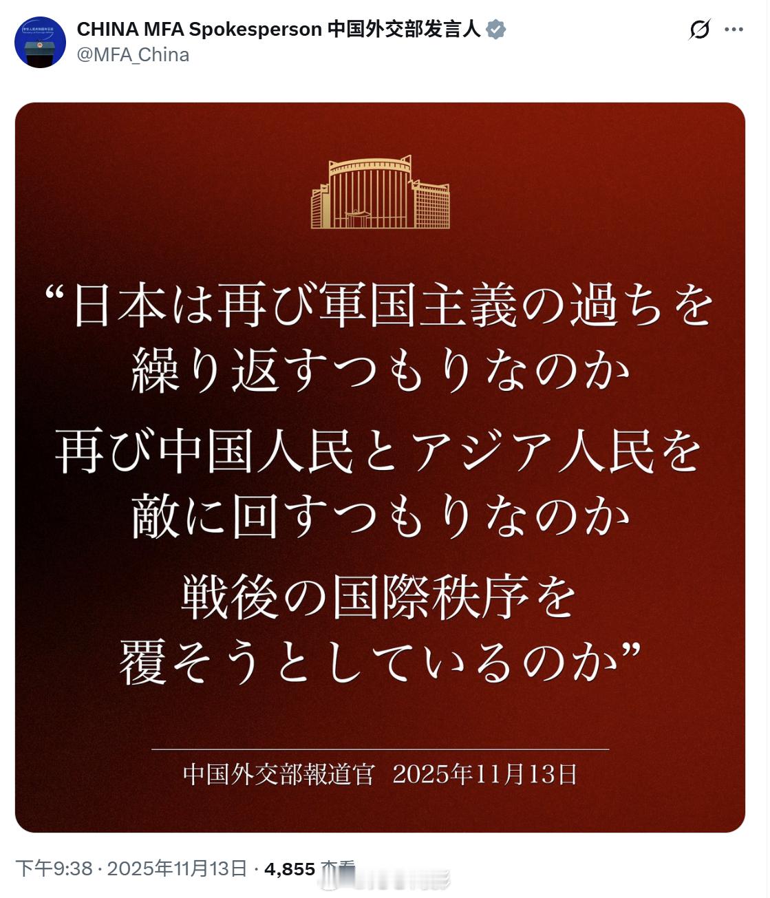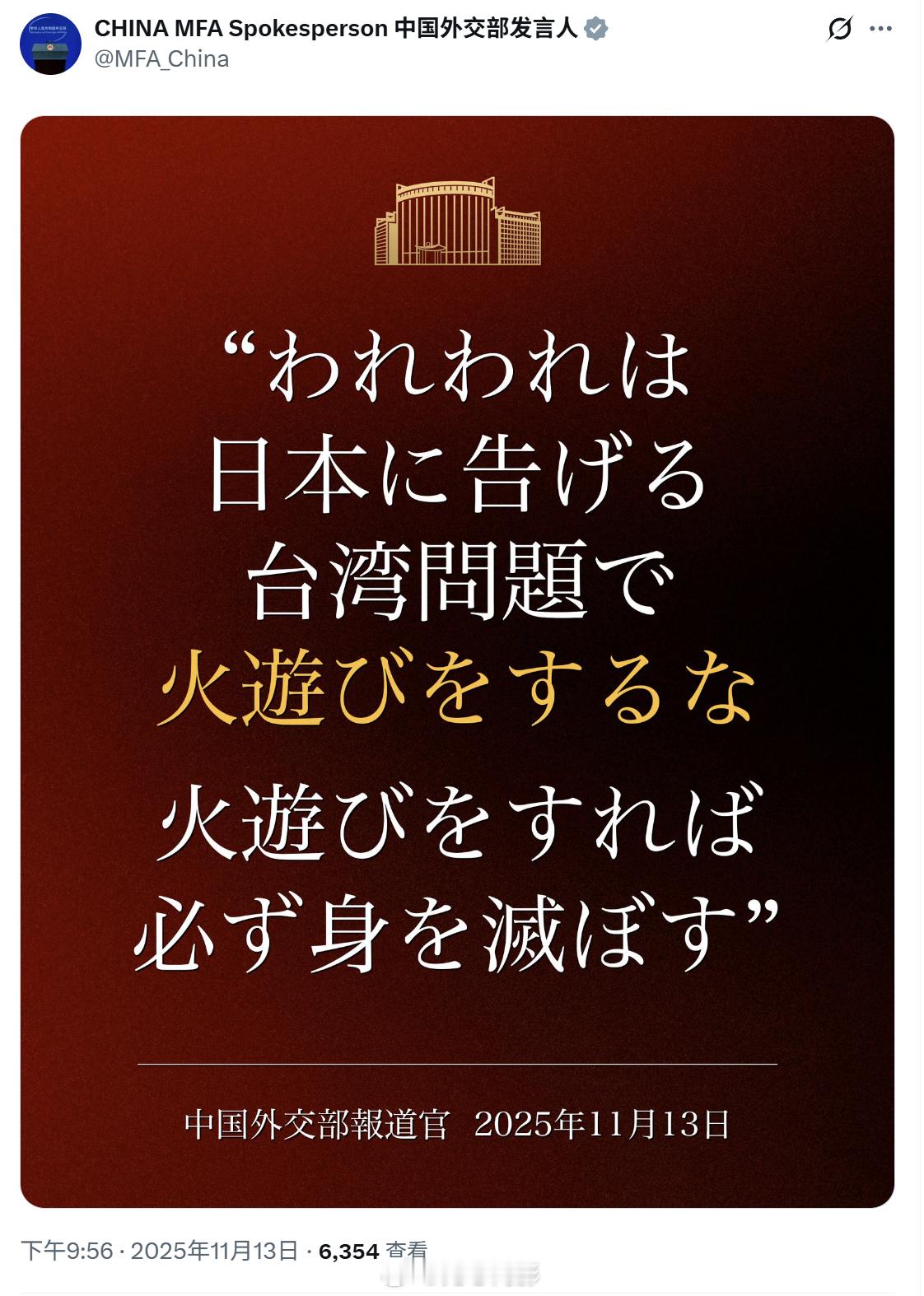 外交部推特官方帐号用日语写道:【日本是打算再次重蹈军国主义的覆辙吗?是打算再次将中国人民和亚洲人民视为敌人吗?是企图颠覆战后国际秩序吗?】【如日方胆敢武力介入台海局势,中方必将迎头痛击。】【我们正告日本,在台湾问题上不要玩火,玩火者必自焚。】
