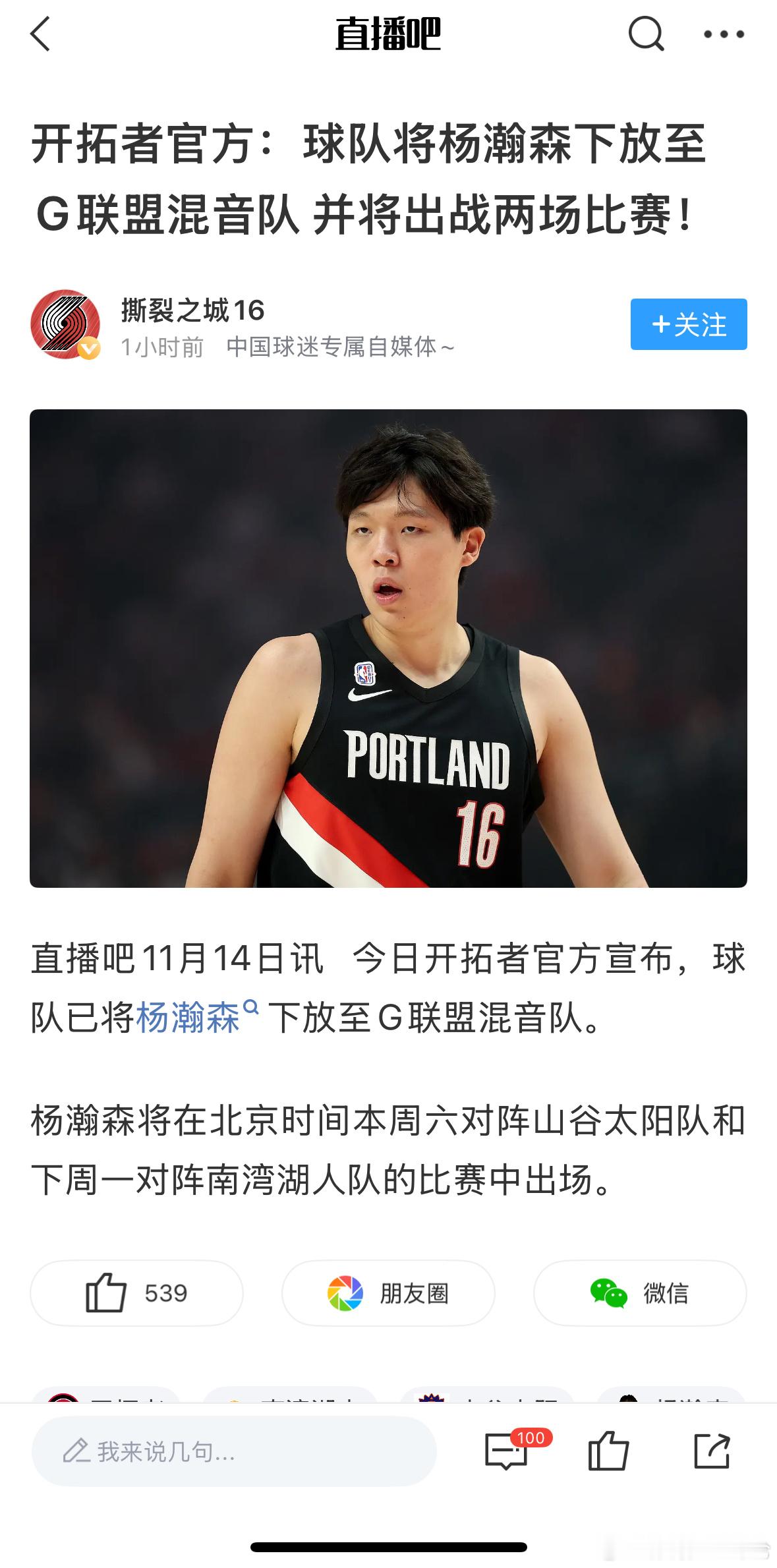 小杨被下放到发展联盟,并将出战两场比赛,期待他的发挥!
