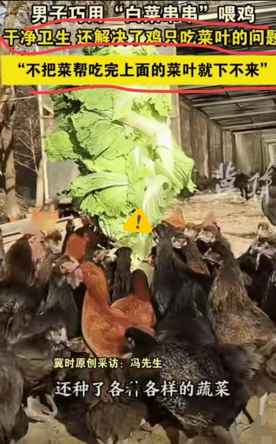 “太有才了!”北京这男子,养着1500多只鸡,鸡还挑食,光吃菜叶不吃菜帮。嘿,他灵机一动,搞出个“白菜串串”喂鸡,这下菜帮也被鸡吃得干干净净。 男子在自家农场散养鸡,还种了不少蔬菜。以往直接把白菜扔地上喂鸡,又脏又浪费,鸡还光挑叶子吃。男子就琢磨出用铁棍串白菜的法子,鸡得吃完下面的,上面的才会掉,不仅卫生,还不浪费。这办法效果杠杠的,鸡吃干净了,也减少生病风险。 这土办法看似简单,实则智慧满满。生活中很多难题,或许就缺这样的巧思。要是你养鸡,还能想出啥妙招不?