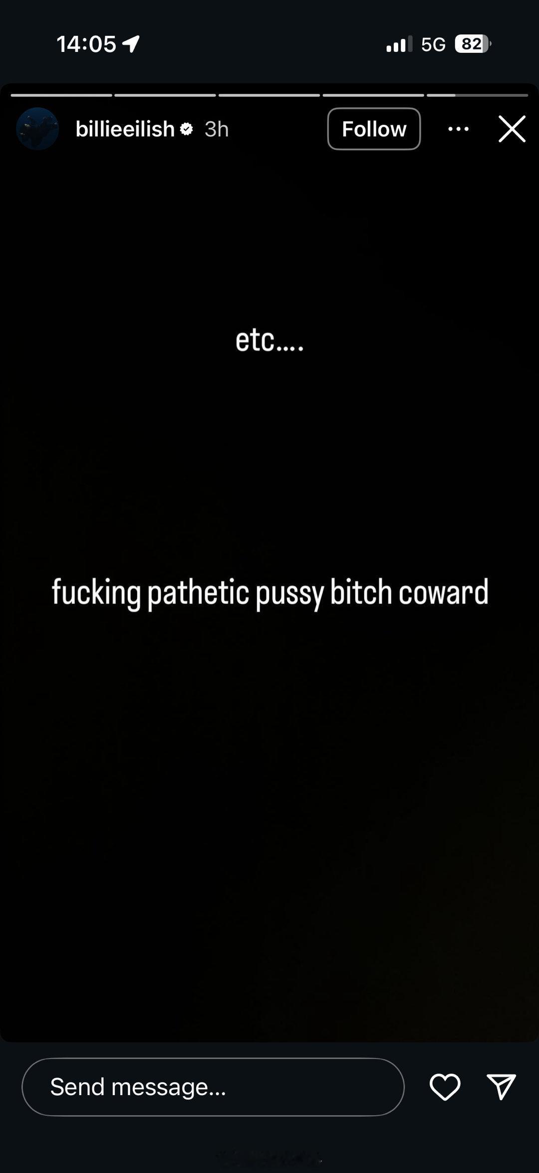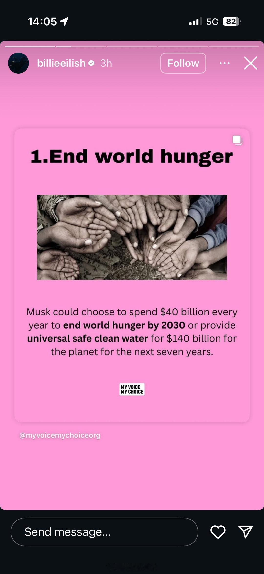 Billie Eilish刚刚在Instagram Story上发了关于马斯克即将成为世界首位万亿富翁的图片,列举了他可以用财富做的善事(如终结世界饥饿、拯救濒危物种、重建加沙等)。值得注意的是,她在最后发布了一条黑底白字的帖子,称马斯克是”fucking pathetic pussy bitch coward”(该死的可悲懦夫) 。马斯克是世界首富,资产总额超过四千亿美元。特斯拉股东刚刚批准了他的薪酬协议,授予他价值1万亿美元的特斯拉股票,但是绑定了诸多难度极大的业绩目标。达不到就什么都没有。就在两周前的10月29日,Billie Eilish在《华尔街日报》创新者颁奖典礼上宣布,她将把”Hit Me Hard and Soft”巡演筹集的1150万美元捐给应对粮食危机和气候变化的组织。这相当于她个人资产净值的四分之一。她还对在场的富豪们说:“如果你是亿万富翁,为什么你还是亿万富翁?不带恨意,但把你的钱捐出去吧” 。