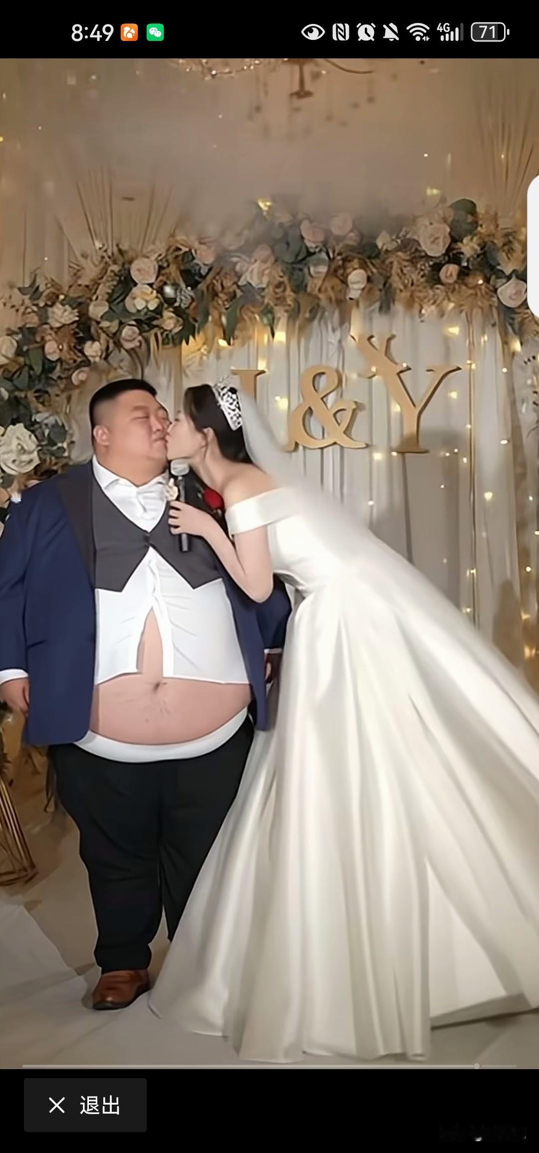 看新郎这个身材,新娘在新郎眼里心里身体里,肯定是非常纯洁的。 新娘的发言:我不是为了他的钱,我是为了爱情。感谢公公婆婆送的别墅和两千万,我爱你,嗯呐!