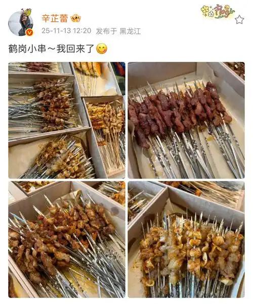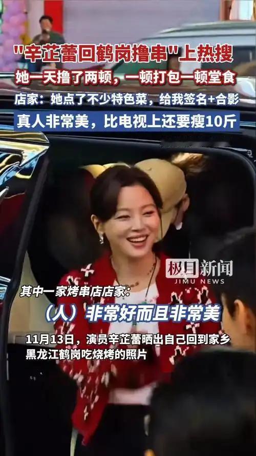68元吃垮鹤岗夜市?辛芷蕾撸串被拍,一身黑衣蹲路边! 11月12日晚,鹤岗老街烧烤摊,辛芷蕾扎着马尾,一身黑衣坐在塑料小凳上,撸着串,嘴里还念叨“这家的蒜蓉得蘸两遍”。桌上签子堆成小山,旁边人拿手机拍,她头都没抬。 这姑娘在荧幕上能演狠角色,回了老家却只惦记这口烟火味。羊肉串十串,五花肉十串,两瓶啤酒,结账68。老板认出她,手一抖,抹零还送盘毛豆。她摆摆手,“别整那些虚的,我就是回来找味儿的。”原来她每年都来,悄悄地,三年了,老板也没往外说。 明星来来去去,鹤岗人不在乎谁红谁不红。他们只认那种愿意蹲下身子、不怕油溅裤脚的人。她没架子,烟火气才肯认她。多少人飞得高了,就忘了哪口饭最香。她偏要回来,坐小板凳,吃老味道。这顿串,是她在补心,还是我们在照镜子?