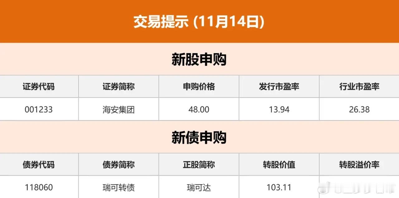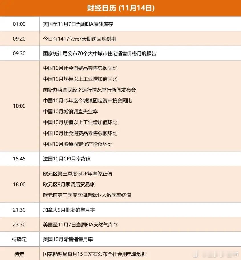 11.14股市早知道:1、外盘汇总:大跌,如图一。 2、交易提示:如图二。 3、财经日历:如图三。 4、三大指数:1)大盘:区间3885-42002)创指:暂观望3)科创50:1403之下,暂观望 5、重要新闻:1)商务部:正加快推进中国—东盟自贸区3.0版升级议定书国内核准工作;2)央行:前十个月人民币贷款增加14.97万亿元,存款增加23.32万亿元;3)金融监管总局近期将发布新修订的《商业银行并购贷款管理办法》;4)国家能源局:鼓励符合条件的社会资本参与油气储备库、液化天然气接收站等投资建设。 6、市场动态:1)我国完成第一阶段6G技术试验。 7、公司公告:1)长联科技:股东麦友攀、富海新材及卢润初拟合计减持不超4.37%股份;2)摩尔线程:本次发行初步询价日为11月19日,申购日为11月24日;3)中芯国际:前三季净利润为38.1亿元,同比增长41.1%;4)华仁药业:股东华仁世纪集团拟减持不超过总股本3%的股份;5)闽发铝业:第二大股东黄天火10月14日-11月13日累计减持938.15万股。(关注点赞+评论,陪你一起到牛市)