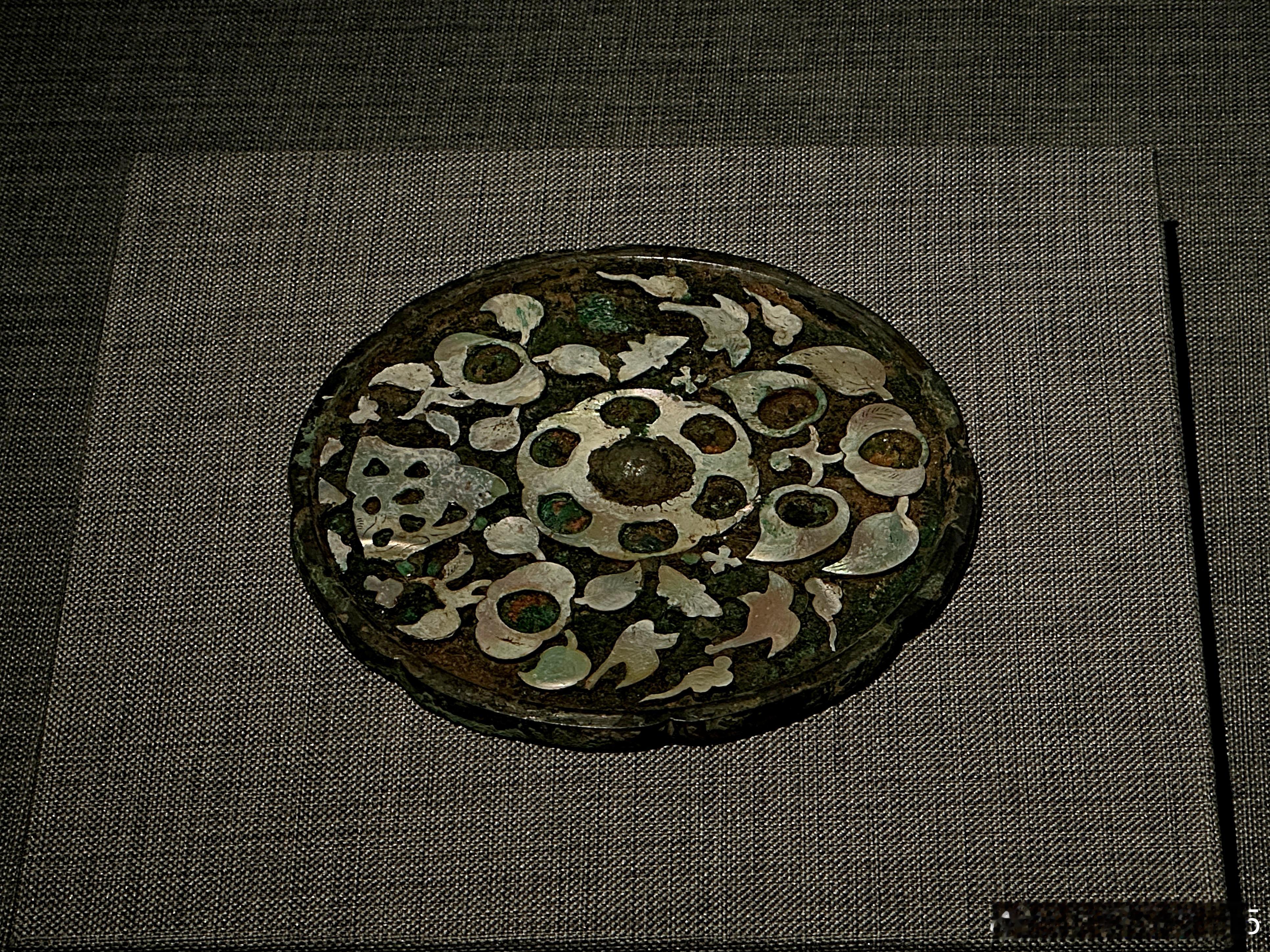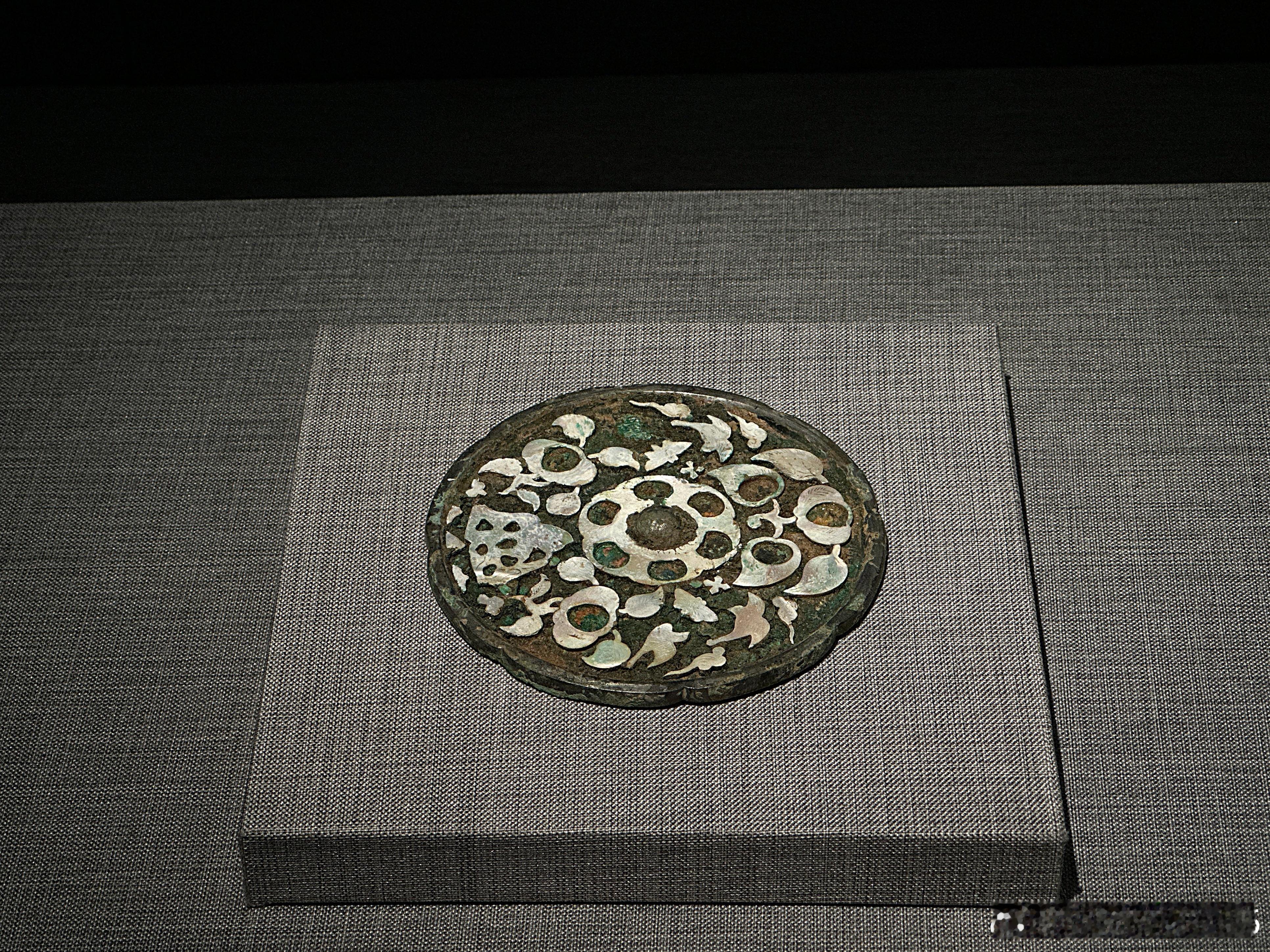 螺钿平脱花鸟纹铜镜 唐 (公元618-907年)南京博物院藏八出葵花形,圆形钮,铜镜背面平脱螺钿花鸟纹。螺钿平脱是唐代最具代表性的漆器髹饰工艺之一,先在漆胎上镶嵌螺片,再全面髹漆,等待干燥后打磨抛光。