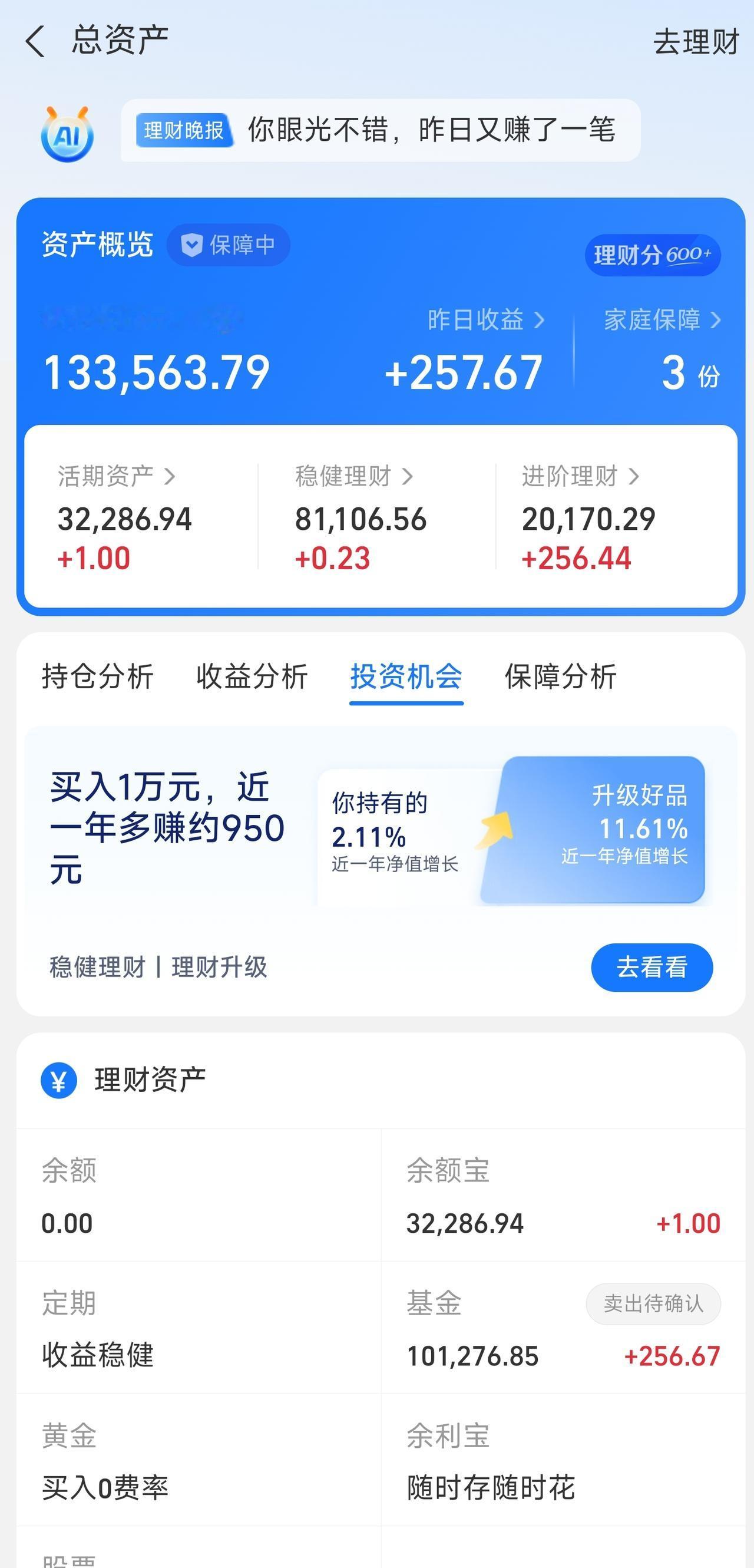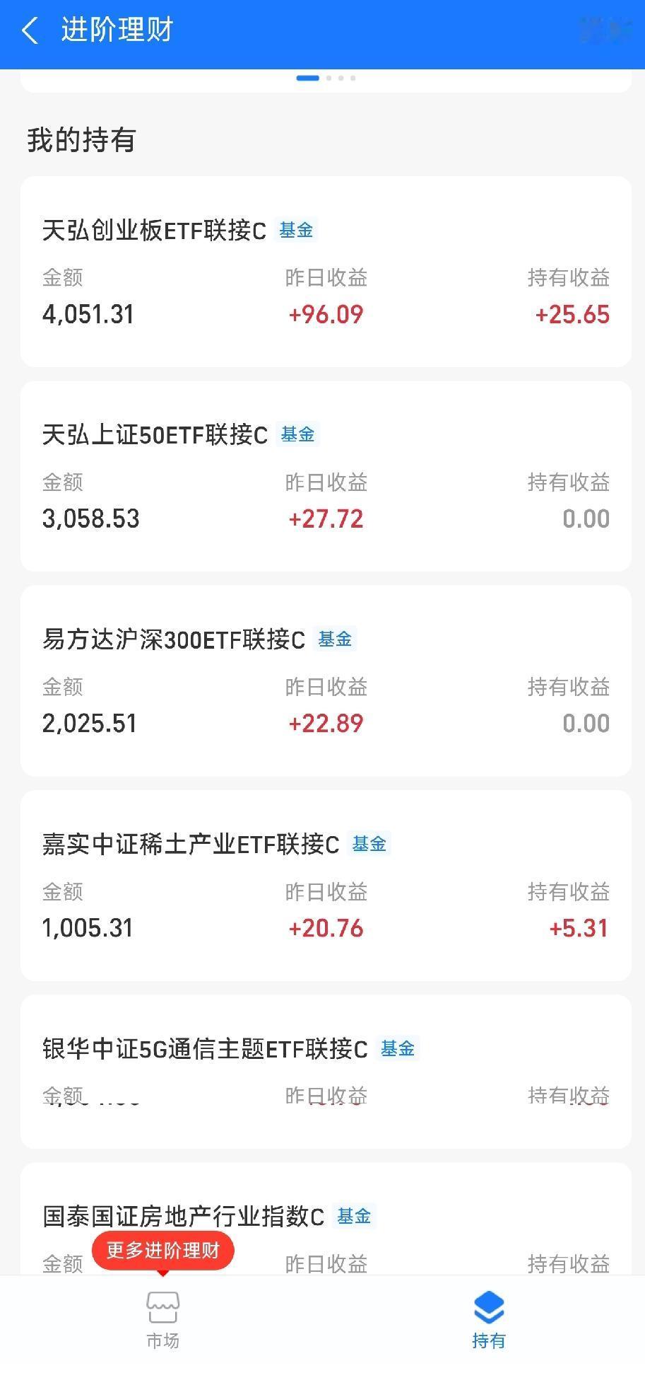普通小白稳健性理财,昨天的收益。一共收益了257。 创业板持有4000。昨日收益96。昨天卖掉了2000。 上证50持有3000。昨日收益27。总收益60,已全部卖掉。 沪深300只有2000。昨日收益23,总收益40。已全部卖掉。 嘉实中证稀土产业,持有1000昨日收益20,总收益5块。 中证券指数证券,只有时间,昨日收益25,总收益5块。 3~5年国债只有4万,抓着收益10块。 7~10年国债,持有4万,昨日收益亏4块。 其实目前我还是比较看好国债的,因为国债正在一个低谷期,他迟早会涨上去的。基金指数