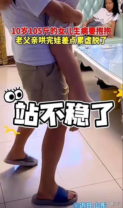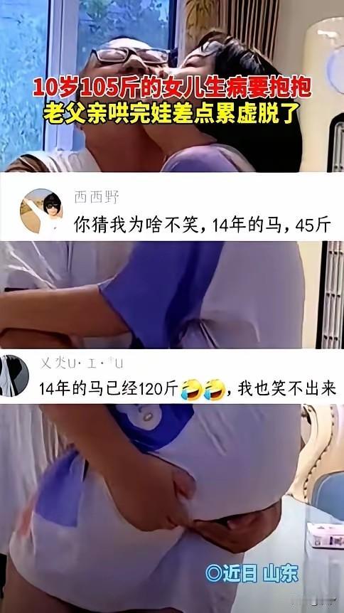 近日山东10岁的女孩生病, 要父亲抱抱, 这老父亲不忍心拒绝孩子, 毕竟孩子生着病呢, 于是只能硬着头皮上了, 十岁的孩子居然105斤。 山东大汉说的就是这吧! 这女孩又高又大, 这体重可把老父亲累坏了, 这体格看着也不像十岁呀, 老父亲抱了一会, 双腿直发抖, 这老父亲不敢当呀, 不过女儿提出的要求又不想拒绝, 只能咬牙坚持了! 这以后学体育是个很不错的苗子! 大家对于这位山东小姑娘累坏老父亲怎么看? 我的家庭相册婚姻与家庭 爸爸抱大的姑娘