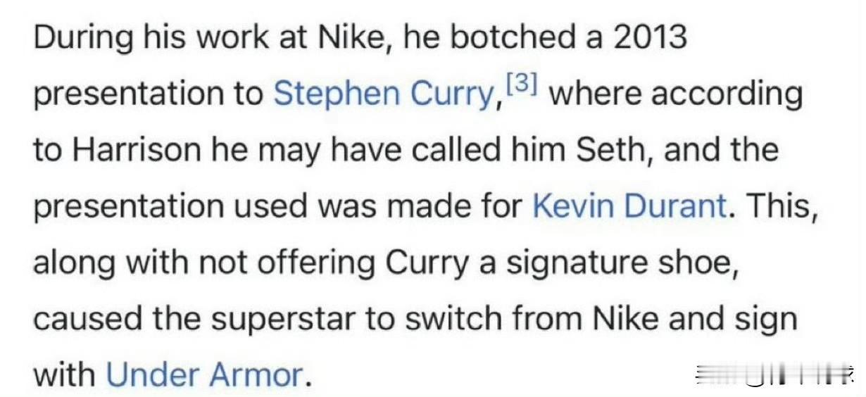 又是尼克-哈里森的杰作! 原来,尼克-哈里森在成为独行侠队总经理之前是耐克北美篮球运营副总裁,正是因为他对库里的敷衍态度,最终导致后者离开耐克转头签约安德玛。 尼克-哈里森有多过分呢?据其本人确认,他在一个公开的展示会中弄错了库里的名字,所用材料是用杜兰特的文件临时修改的,上面还有杜兰特的名字,这让库里感到不受尊重,最终选择离开。 万万没想到,库里离开耐克竟然也是尼克-哈里森的杰作,如果有一个工作捅娄子排行榜,尼克-哈里森绝对榜上有名。作为职业经理人,犯一个大错都不得了了,而尼克-哈里森竟然有两个,让耐克失去了库里,让独行侠队失去了东契奇,这两件大事足以让尼克-哈里森遗臭万年!