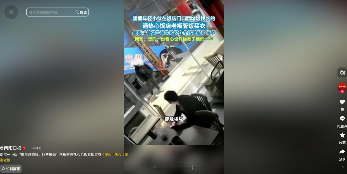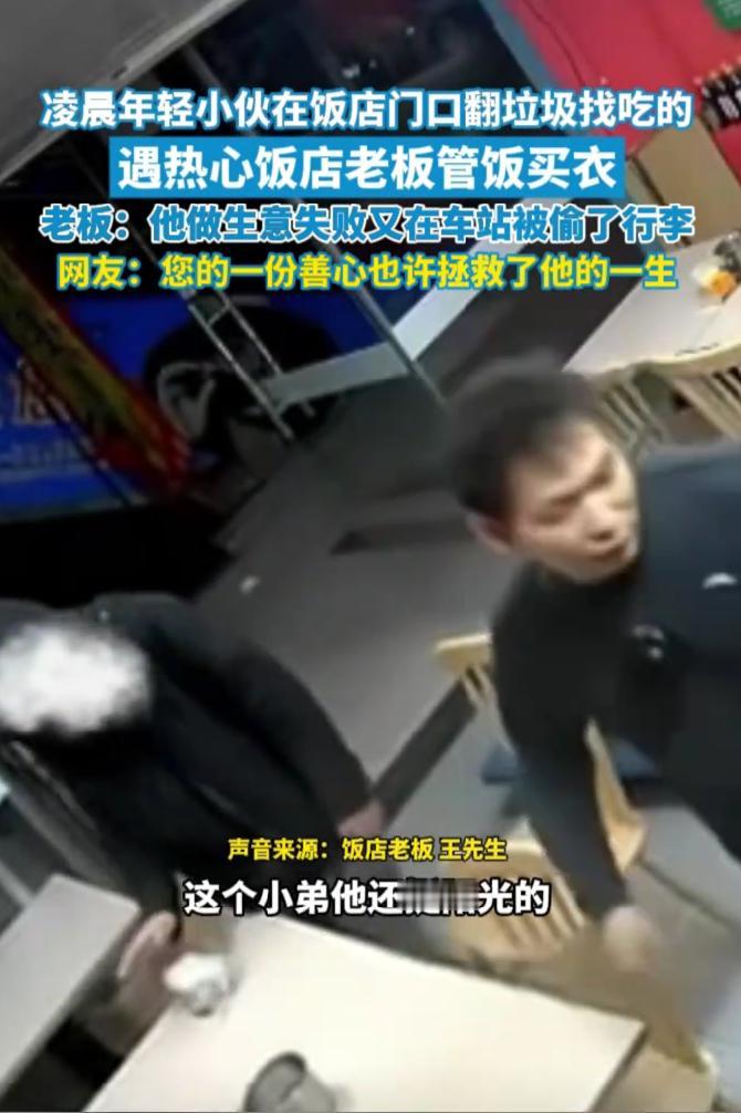 “这个餐馆老板必须让他火!”江苏南京,餐馆老板准备打烊回家,突然看到一个小伙子在门口的垃圾袋里翻东西,他忍不住问小伙找什么呢?小伙说:“我肚子饿饿了,想看看里面有没有吃的?”而接下来老板的做法,让小伙感动流泪! 江苏南京的深夜,街头的灯火已经渐渐稀疏,一家餐馆里,王老板正收拾着桌椅,准备打烊回家。,忙活了一整天他只想赶紧关掉店门,回到温暖的家里歇一歇,可就在他抬手要锁门的瞬间,眼角余光瞥见门口的垃圾桶旁有个身影在动。 他凑近一看原来是个二十多岁的小伙子,正蹲在散发着异味的垃圾袋里翻找着什么,动作小心翼翼,还带着点局促,深夜的风带着凉意,小伙子穿得单薄头发乱糟糟的,身上也沾了些灰尘,看着格外落魄。 王老板没有像有些人那样皱眉驱赶,也没有假装没看见,而是轻轻走过去,放低声音问了一句,找什么呢?小伙子听到声音猛地抬起头,脸上满是慌乱和不好意思,头埋得更低了,好半天才低声挤出一句话,说自己肚子饿,想在垃圾桶里找点能吃的东西填填肚子。 看着小伙子窘迫得手足无措的样子,王老板心里一下子就软了,他没多说什么,转身回店里拿出了本来准备带给女儿当夜宵的面包,递到小伙子手里。 可递出去之后王老板看着小伙子攥着面包、依旧紧绷的肩膀,又觉得这似乎不够,面包是凉的,而且就这么让他站在街边吃,未免太不尊重人,他当即改变了主意,招呼小伙子:“进来吧,店里还 没完全收拾好,我给你做碗热乎的。” 说着就把小伙子领进了店里,顺手关上了店门,隔绝了外面的寒意和路人可能投来的异样目光,店里还留着灯光和饭菜的香气,和刚才街边臭气熏天的垃圾桶旁相比,简直是两个世界。 王老板让小伙子坐在餐桌前,自己则走进后厨,烧水煮面,还特意卧了个荷包蛋,又炒了个简单的小菜,不一会儿一碗热气腾腾的面条就端到了小伙子面前,香气扑面而来。 看着眼前冒着热气的面,又看看王老板温和的眼神,小伙子再也忍不住了,眼泪唰地就流了下来,一边用手背抹眼泪,一边连连向王老板道谢,也正是这份不加评判的善意,让他终于卸下了所有防备,把自己的遭遇慢慢说了出来。 原来小伙子是外地来的,之前尝试创业可没成想赔了个精光,走投无路之下,他想着去上海投靠朋友,可刚到南京车站,就不小心把所有行李都弄丢了。 手机、钱包、身份证,所有能证明自己身份、能和外界联系的东西,全都没了,一个在现代社会打拼的年轻人,就这么突然被抽走了所有 “身份证明”,成了一个 “无名无分” 的人。 没了身份证,他连想找份搬砖的体力活都没人要,生怕他是坏人,身上一分钱没有,连口热饭都吃不上,只能靠翻垃圾桶勉强果腹,他说这些天自己受尽了冷眼,甚至被人驱赶过,心里又绝望又委屈,要不是王老板愿意拉他一把,他都不知道该怎么办了。 王老板听着心里很不是滋味,他明白一碗热面能解决小伙子当下的饥饿,却解不了他的 “燃眉之急”,没有身份证他永远无法重新融入社会,只能一直陷在困境里。这才是最根本的问题。 所以王老板没有只停留在 “给一碗面” 的善意上,他当场就跟小伙子说:“你别着急,明天下午我带你去市民中心,先把身份证补办了。” 这句话就像一道光,瞬间照亮了小伙子灰暗的处境,补办身份证需要时间和流程,王老板怕他这段时间没地方去、没东西吃,又接着说:“在找到工作之前,你随时来店里吃饭,不用客气。” 第二天王老板果然兑现了承诺,带着小伙子去了市民中心办理身份证补办手续,之后他还带着小伙子去理了发,又给他买了一身干净的新衣服,看着镜子里焕然一新的自己,小伙子眼眶又红了,他说长这么大,除了家人很少有人这么真心实意地帮他。 后来王老板把这件事拍成了短视频发到了网上,他不是想炫耀自己做了好事,只是觉得这个世界上,谁都可能遇到难处,希望能通过自己的经历,呼吁大家对那些暂时陷入困境的人多一点包容,多一点善意,不要轻易用偏见去否定一个人。 这段视频很快就在网上火了,网友们纷纷为王老板点赞,都说 “这个老板必须火!”“这才是真正的善良,不止救急,还救穷,更救心”“善良不是简单的施舍,而是尊重和解决根本问题”,有人说王老板的善举,不仅帮了一个年轻人,更让大家看到了人与人之间最珍贵的信任和温暖。 其实善良从来都不是什么惊天动地的大事,而是藏在这些细微的举动里,王老板的善举,不仅改变了一个年轻人的命运,更温暖了无数网友的心,也让我们相信,这个世界上,总有不期而遇的温暖,和生生不息的希望,这样的老板真的值得被更多人知道,值得火遍全网! (信息来源:南阳日报)