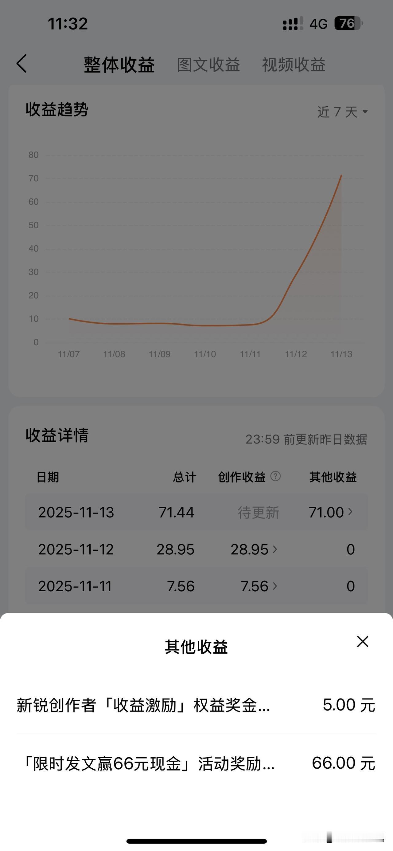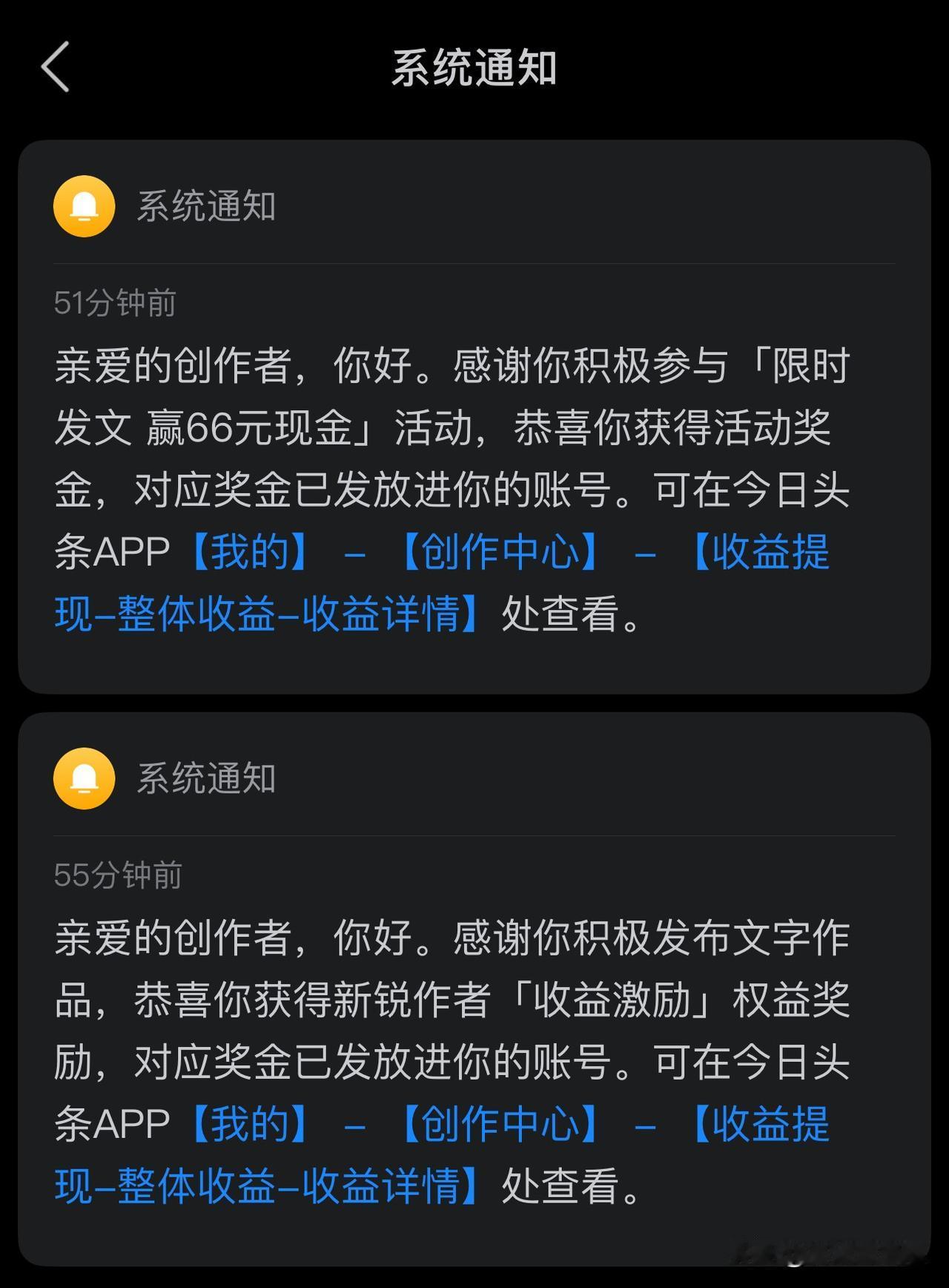 第二周的66元到账了 就在刚才,打开头条的收益查看,收到71元,是上周11月3日至11月9日一周的两笔收益。一笔是“限时发文 赢66元奖金”和“新锐创作者收益激励”5元收益,共71元。 连续两周的“限时发文 赢取66元奖励”都拿到了,开心之余,内心更是充满了对吴石等英雄们的感激。 第二周一开始还担心达不到标准,正好看了《沉默的荣耀》,深受感动,于是写了一篇,结果单此一篇就超过了一万的阅读量,再一次对先烈们表示感谢,未曾谋面,深受其恩,英雄已逝,精神永存! ————————