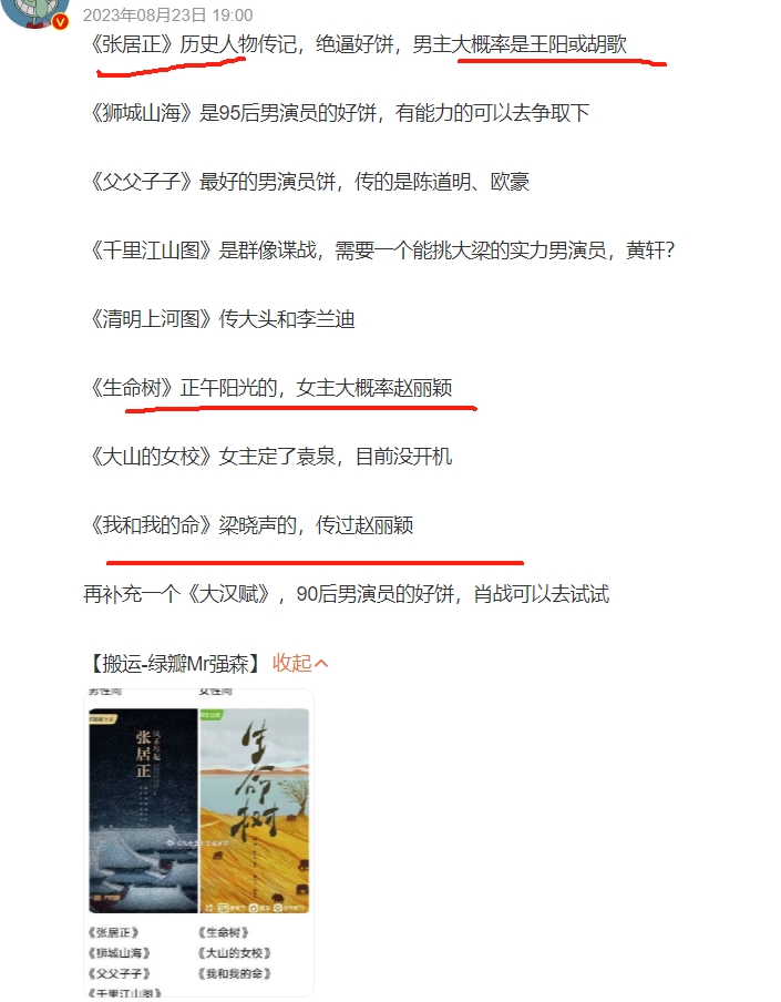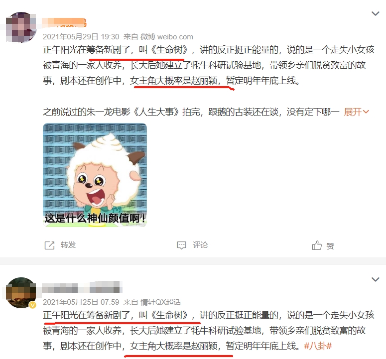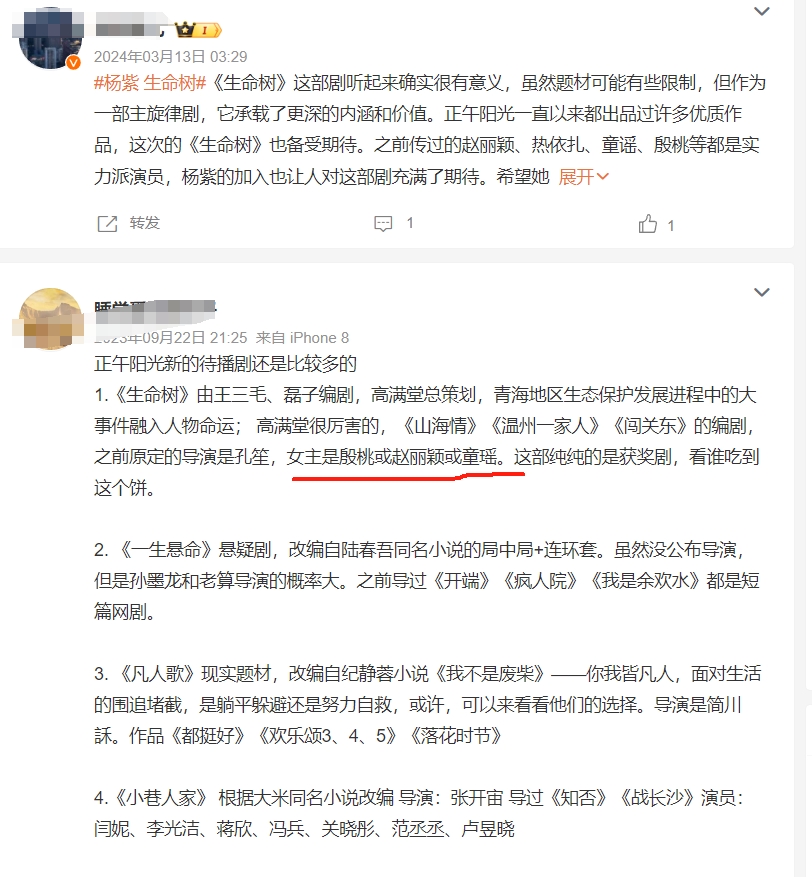 从2021年开始,就一直说正午阳光的《生命树》由赵丽颖出演,直到2024年,赵丽颖对接这边才辟谣了这个饼,然后传到了杨紫身上,不过正午阳光也为此多次发布声明辟谣,说《生命树》还在筹备,演员未定,再到后来官宣杨紫,然后赵丽颖被说舔饼失败,赵丽颖虽然没出演这部剧,但确实是免费给热饼3年。