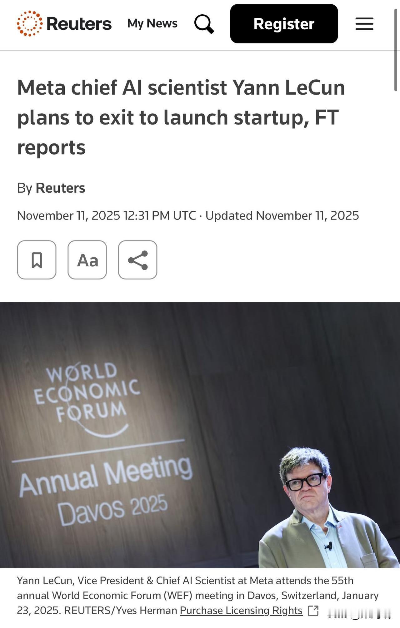65岁被28岁管,Meta首席AI科学家不干了!一场人事动荡,揭社群巨头技术路线大分歧。 Meta首席AI科学家、图灵奖得主杨立昆(Yann LeCun),近日传出正与同事及投资人洽谈,计划离开他服务超过十年的Meta,创办新公司专注于他所主张的「世界模型」(world models)研究,这背后不仅是Meta在AI人事布局上的动荡,更是代表着AI发展技术路线分歧。 根据《金融时报》报导,杨立昆已向同事透露,他计划在未来几个月内离开Meta,并创办一间自己的公司,目前也已和投资者进行初步联系。 杨立昆在2013年加入Meta,多年来领导着基础AI研究(FAIR)团队,是Meta在AI领域的主要领导者。但近几个月来,随着Meta将重心转移到新成立的AI团队,追求超越人类智慧的超级智慧,FAIR也被认为受到冷落,甚至在先前的裁员中规模有所缩减。 这场变革的导火线,可追溯到今年推出的Llama 4模型表现不如预期,外界反应平平。为了追求突破,Meta执行长马克·扎克伯格(Mark Zuckerberg)以140亿美元收购资料标注公司Scale AI 49%股权,并直接邀请该公司28岁的创办人汪滔(Alexandr Wang)空降,负责主导Meta的AI发展方向。 同时,Meta 大举招募逾 50 名顶尖工程师和研究人员,成立了新的AI部门TBD实验室以实现祖克柏所追求的超级智慧愿景。 作为长期领导Meta在AI领域方向的负责人,65岁的杨立昆在组织调整后,这位图灵奖得主现在必须向年仅28岁的汪滔汇报工作。 这种变化代表着Meta在AI研究重心的转移。FAIR专注于5到10年后的基础AI技术突破,而新成立的TBD实验室则将资源集中在快速迭代、追求短期突破的超级智慧目标上。这种战略的转变,让FAIR的资源和关注度遭到大幅压缩。近期Meta宣布在AI部门裁员600人,FAIR团队的规模便受到缩减。 杨立昆领导的FAIR曾于2023年开发了Meta首个开源模型Llama。然而,后续的Llama版本已转由公司另一个团队负责开发与训练。更令人唏嘘的是,最初Llama研究论文上的14位研究人员,如今只剩下一人仍在公司服务。 这一系列变动,都让这位AI大咖的长期付出蒙上阴影,他对AI发展方向的声音也逐渐在公司的战略布局中被边缘化。 杨立昆的离职意图,除了内部组织的变化外,更深层的原因在于他与 Meta 在技术路线上的根本分歧。他一直以来都是当前主流技术大型语言模型(LLM)的强烈怀疑者。他曾在公开场合毫不留情地批评,目前的大型语言模型「比猫还笨」,并断言这种技术永远不可能实现通用人工智慧。 杨立昆认为,大型语言模型对「物理世界怎么运作」的理解很弱;要像人或猫那样能预判现实、制定行动计划,AI必须从视讯及空间资料学出内在因果与可预测的部分,形成「能想像未来状态」的模型,他称之为世界模型。 「我在矽谷的各个角落──包括在Meta──都没有交到朋友。」他曾于麻省理工学院的一场座谈会上坦言,「因为我说在三到五年内,世界模型将成为AI架构的主导模型,没有人会在头脑清醒的情况下使用我们今天拥有的大型语言模型。」 杨立昆的公开质疑,显然与马克·扎克伯格将大型语言模型视为实现超级智慧核心路径的策略背道而驰。再加上现在投资者对Meta的AI投资有着越来越大的质疑与压力,这势必促使马克·扎克伯格更倾向于追求快速见效的大型语言模型路线,进一步加深了两者在技术路线上的分歧。