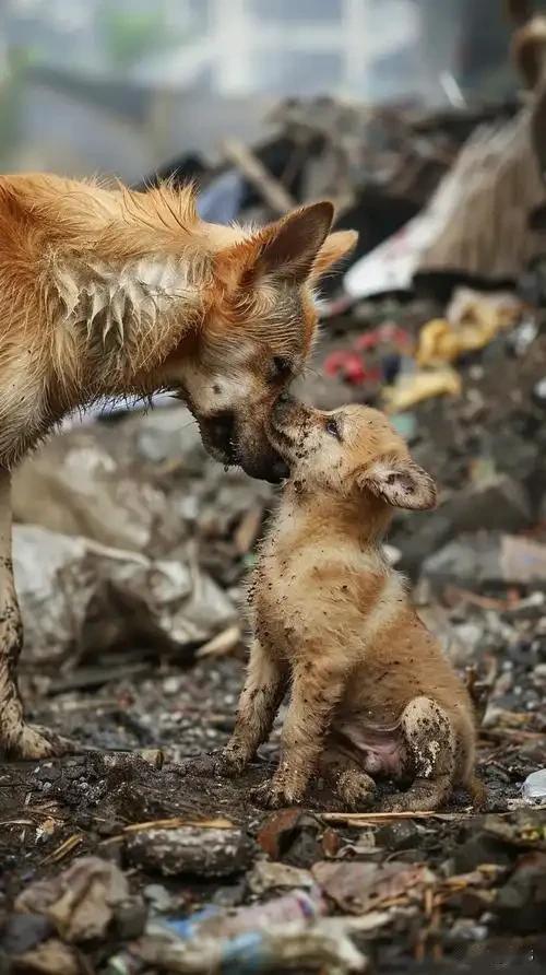 太可怜了!这天,一位拾荒老人来到一个垃圾场找寻废品去卖,结果当他来到这里的时候,看到令人伤感的一幕,一只流浪狗妈妈正低头和小奶狗亲昵的碰脸,似乎在交代着什么。 随后就准备离开它,这不会是要遗弃孩子吧,在这么恶劣得关键下估计小奶狗也难以存活,于是善良的老人决定收养它们,它颤巍巍地掏出食物去投喂它们,然后就带着它们回去了。 虽然老人的条件也不好,但至少能给狗狗母子一个家和食物。相信在他的照顾下,狗狗母子也会越来越好的。
